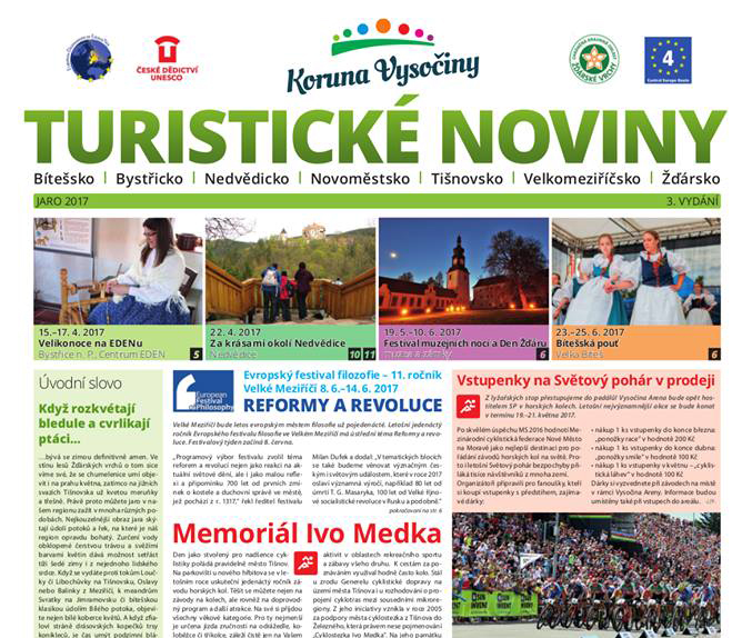 Najdete v něm informace o připravovaných akcích a tipy na výlety za zážitky, sportem, kulturou. Titulní strana přináší pozvánku na jedenáctý ročník Evropského festivalu filozofie ve Velkém Meziříčí. Nechybí přehled jarních turistických pochodů, pozvánka pro cyklisty na Vrchařskou korunu Vysočiny. „Zvláštní akcent letošního roku na památky a příběhy českého baroka se zrcadlí i ve zvýšeném množství stran novin, které se věnují kulturním akcím v regionu, kde je z čeho vybírat od folklóru, přes moderní zábavu, až po klasickou hudbu a filozofii. Kulturní váhu roku 2017 pak zesiluje i 340. výročí narození geniálního architekta J. B. Santiniho-Aichla,“ přibližuje náplň novin Vladimír Vecheta, ředitel Koruny Vysočiny. Kalendář nejvýznamnějších akcí v destinaci v dubnu, květnu a červnu najdete na poslední straně novin.