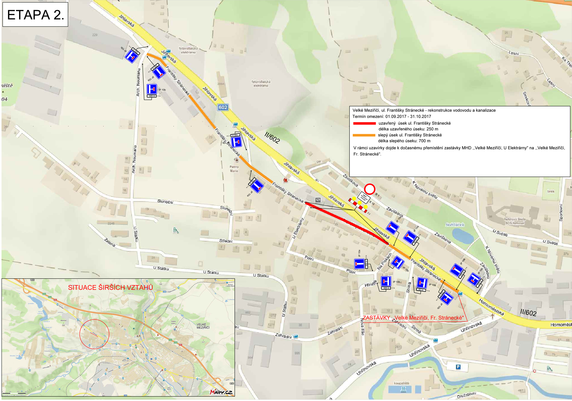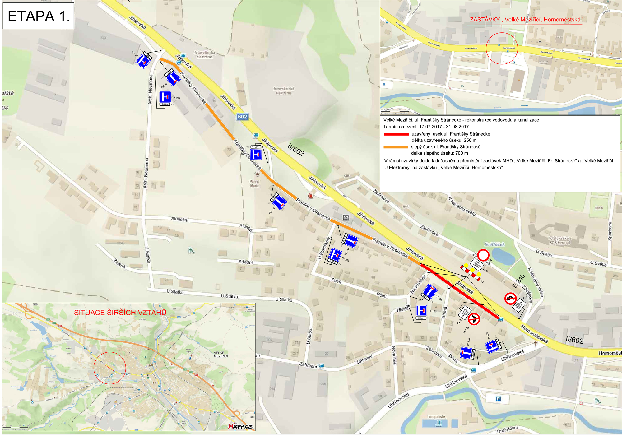 Uzavírka ulice je povolená na dvě etapy. Do konce prázdnin bude uzavřen úsek mezi křižovatkami s ulicí Jihlavská a Na Pískách. Od prvního září do konce října pak bude uzavírka pokračovat mezi křižovatkami s ulicí Na Pískách a U Elektrárny.