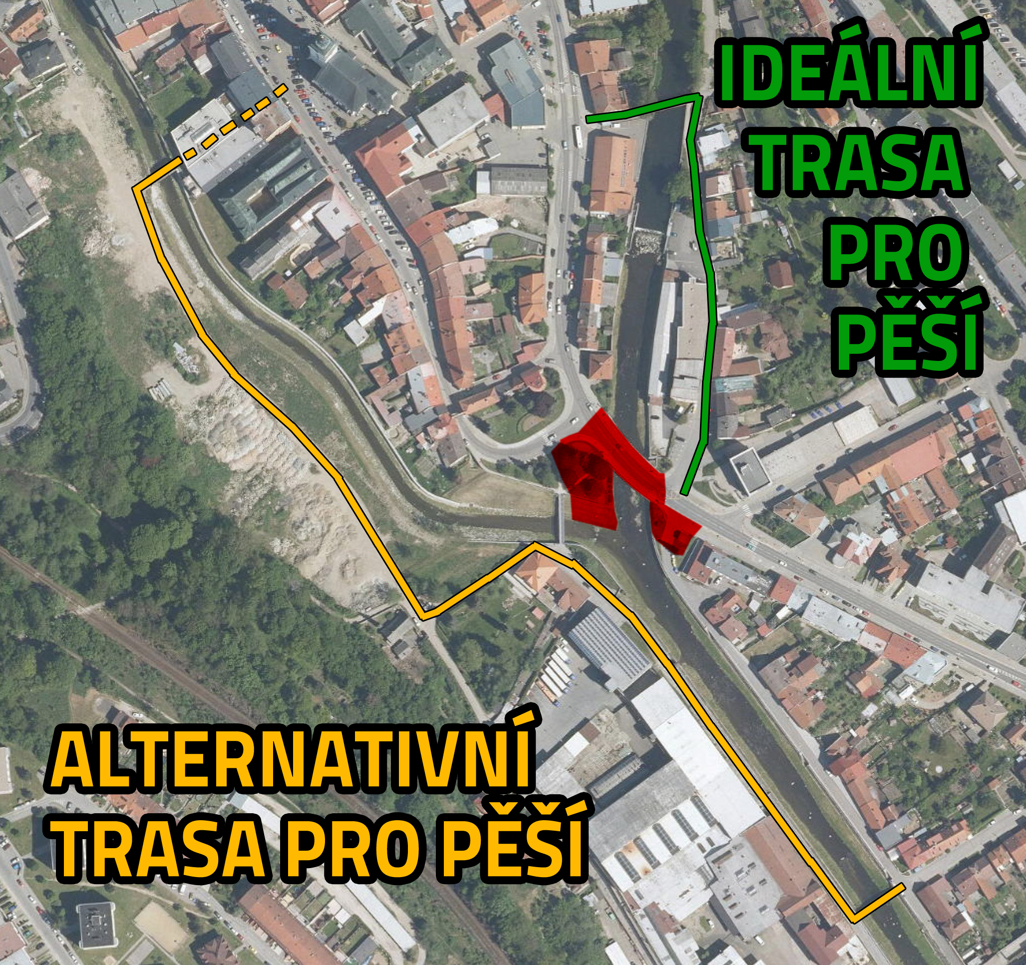 Most se dá pěšky obejít ulicí Moráňskou a Hřbitovní a poté po lávce přes řeku Oslavu. Využít se dá také lávka na ostrůvku, nebo průchod areálem bývalého Svitu a pasáží na náměstí. "S majitelem pasáže je volný pohyb chodců vyjednaný," potvrdil starosta Necid.