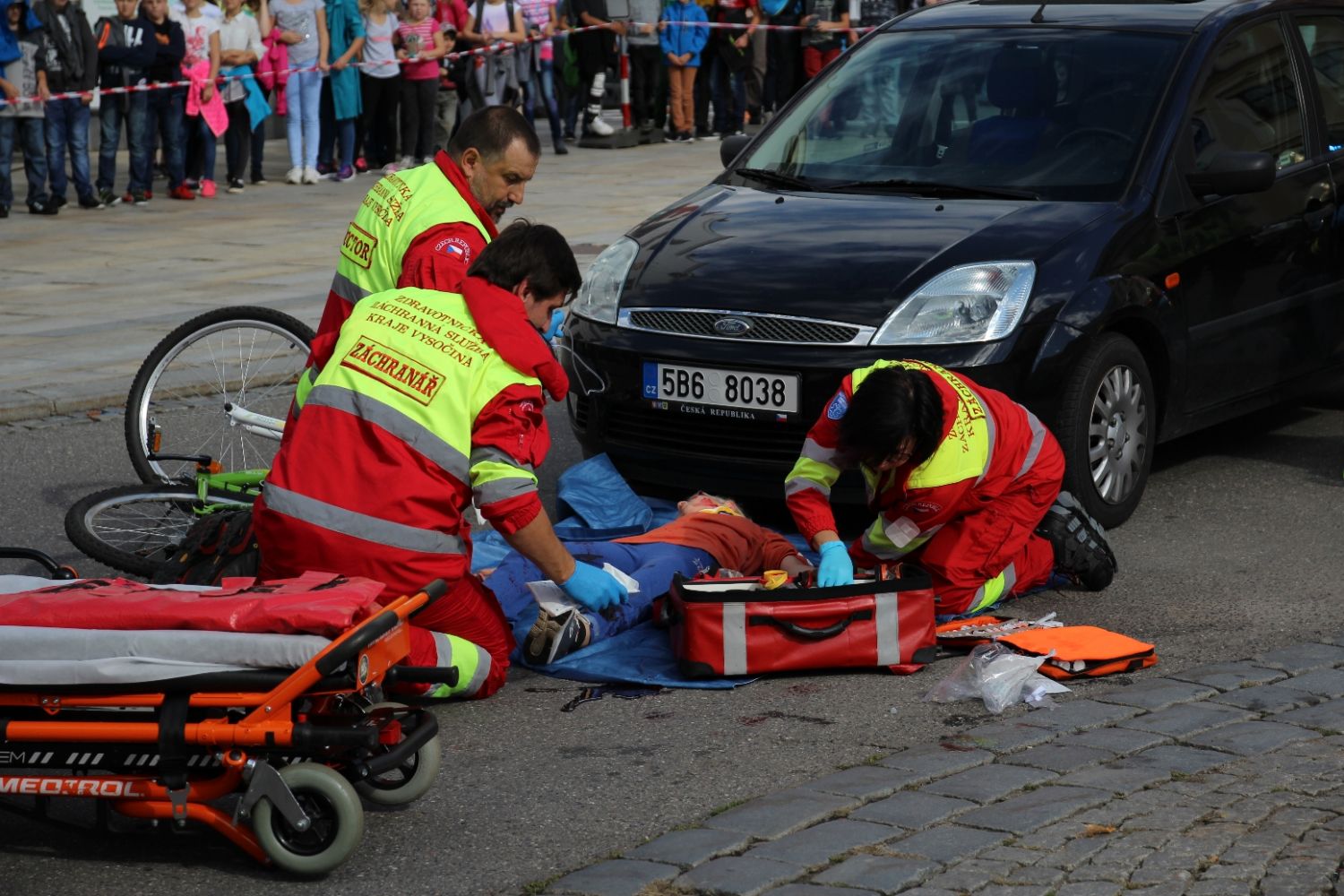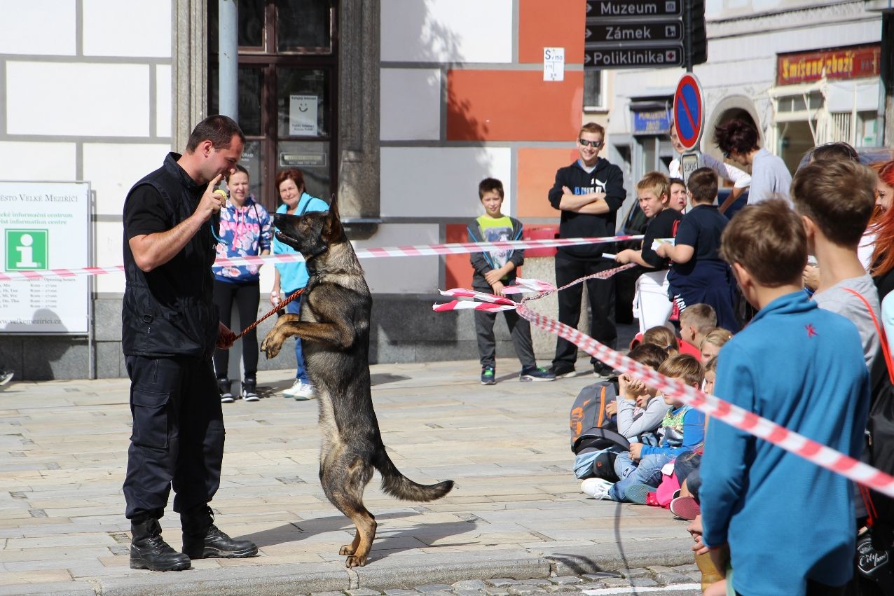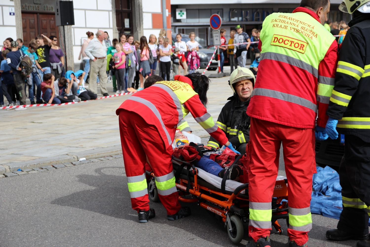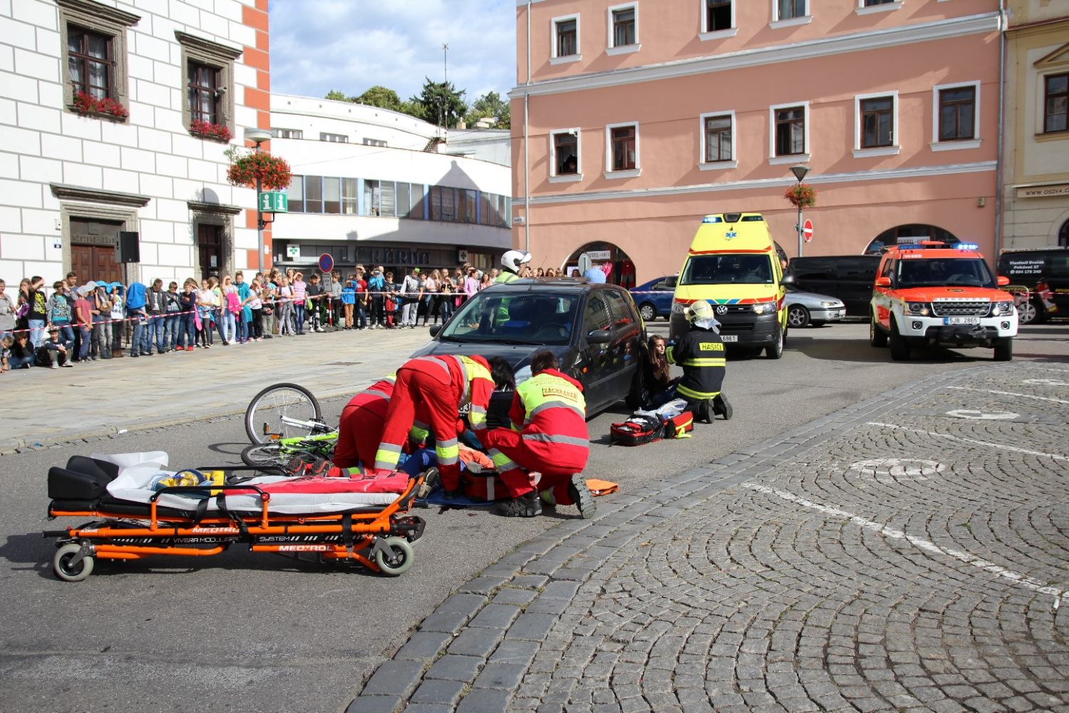 Houkání, blikající majáky a nářek zraněného provázely rychlý zásah zdravotnické záchranné služby při dopravní nehodě cyklisty s osobním autem na náměstí. Následovala bezpečná likvidace požáru oleje a benzinu profesionálními hasiči a práce policejních kynologů se služebními psy a následné zadržení pachatele. Zmiňované ukázky mohli vidět žáci škol i veřejnost, kteří se sešli dnes dopoledne na náměstí ve Velkém Meziříčí. Akci dokreslovala přehlídka techniky a zásahových vozidel. Děti mohly auta prolézt, prohlédnout si vybavení, usednout za volant. Posléze nadšeně uvítaly možnost pohladit si služebního psa, který se před chvílí tvrdě a bez milosti zakousl do rukávu pachatele, jenž po něm střílel z pistole, a hned poté trpělivě snášel desítky dětských rukou na svém těle.