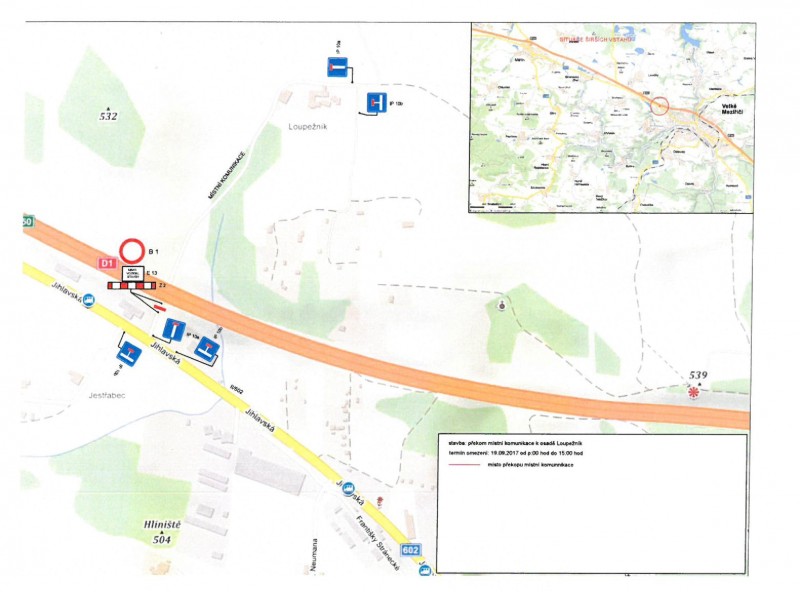 Odbor dopravy města Velké Meziříčí oznamuje, že v úterý 19. září bude uzavřena účelová komunikace Loupežník. Uzavírka se týká úseku mezi silnicí č. II/602 a podjezdem pod dálnicí D1. Nařízená objízdná trasa povede po komunikaci přes obec Lavičky.