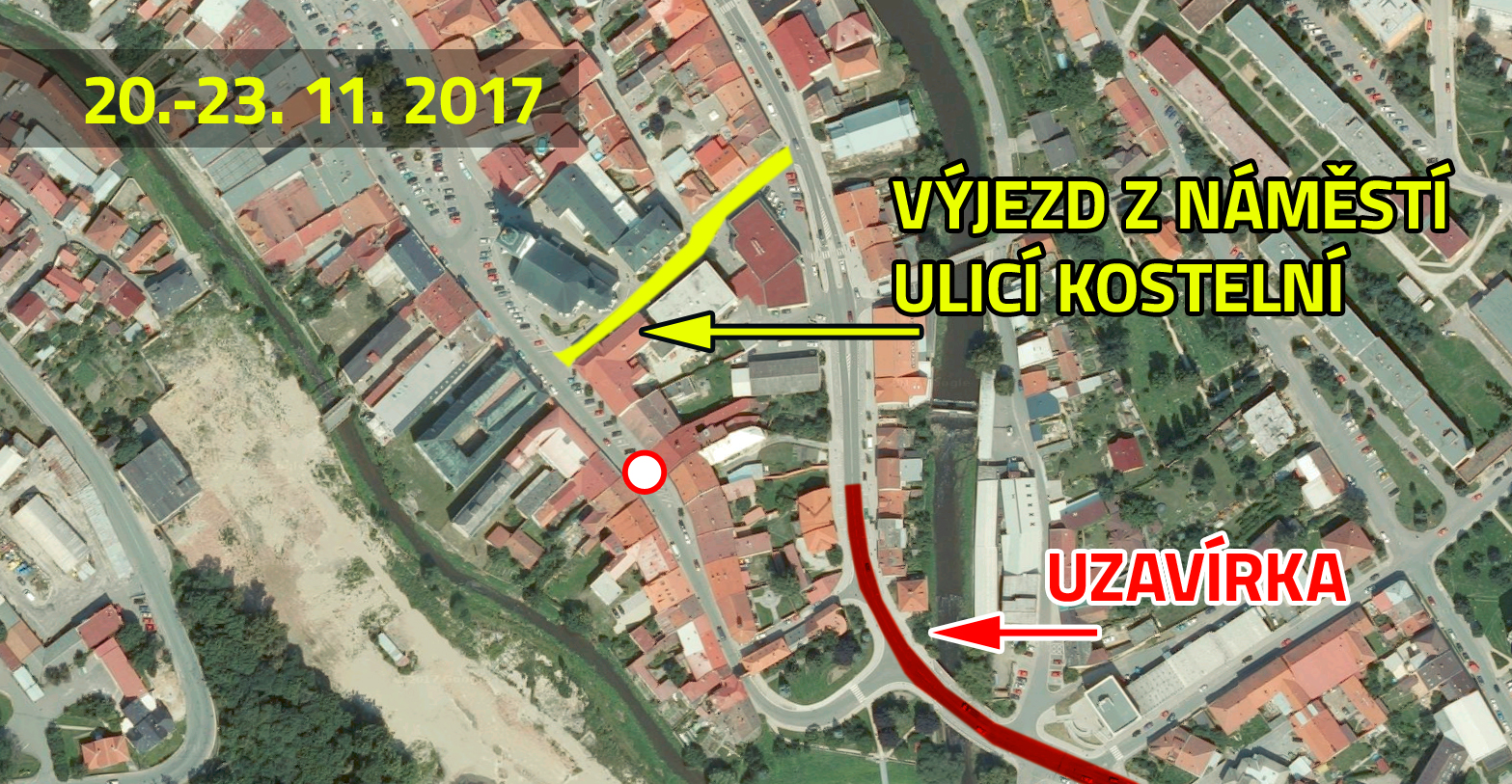 Od pondělí 20. listopadu do čtvrtka 23. listopadu nebude možné z náměstí vyjet Komenského ulicí. Výjezd bude provizorně ulicí Kostelní kolem OD Kotvička na ulici Novosady.