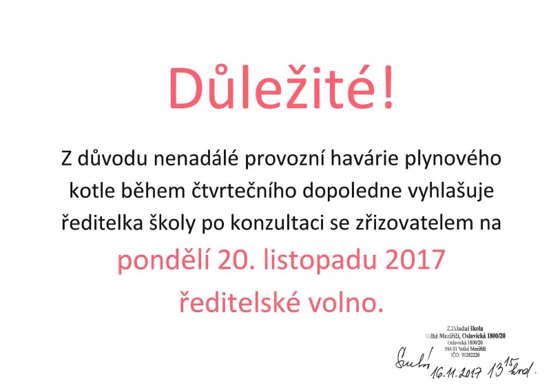Žáci Základní školy Oslavická budou mít v pondělí 20. listopadu 2017 ředitelské volno. Důvodem je nenadálá provozní havárie plynového kotle.