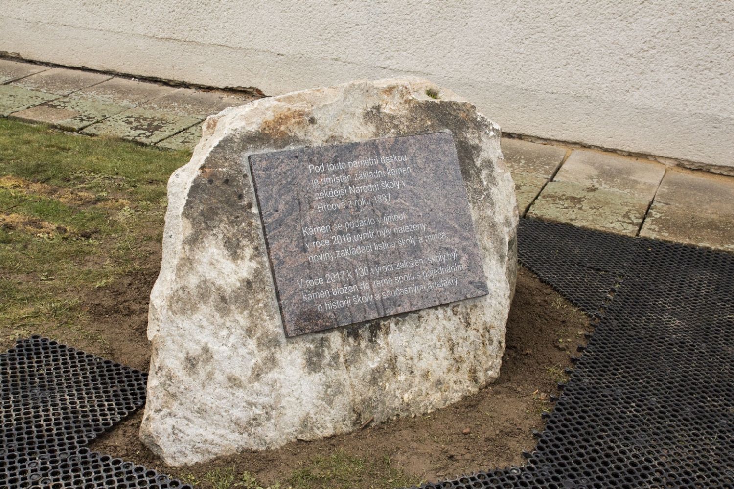 Pod pamětní deskou v zemi je uložen základní kámen školy s časovou schránkou, v níž jsou uloženy informace pro další generace. „V plastové nádobě je šest dokumentů o historii zdejší školy i Hrbova a Svařenova, také informace o současné době. Dále dvě fotografie – jedna z vyjmutí kamene z budovy školy a na druhé jsou nynější členové komise pro místní správu Hrbova a Svařenova. K tomu současné kovové mince a jedna specialita – láhev slivovice z roku 2002,“ uvádí Vladimír Sedláček, předseda komise pro místní správu.