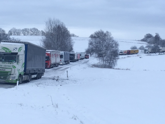 Další kamiony pak blokovaly i silnice nižších tříd, neboť objížděly neprůjezdnou dálnici.