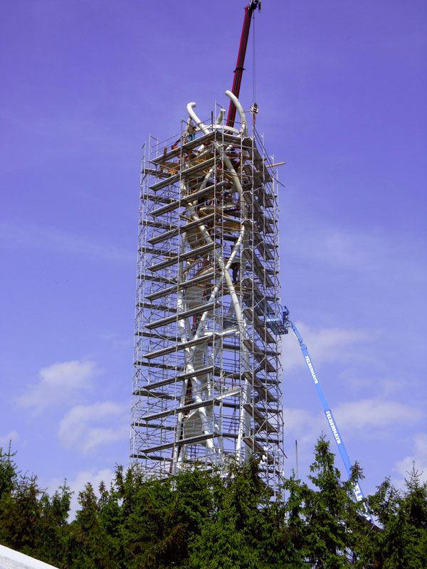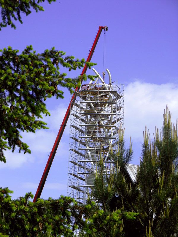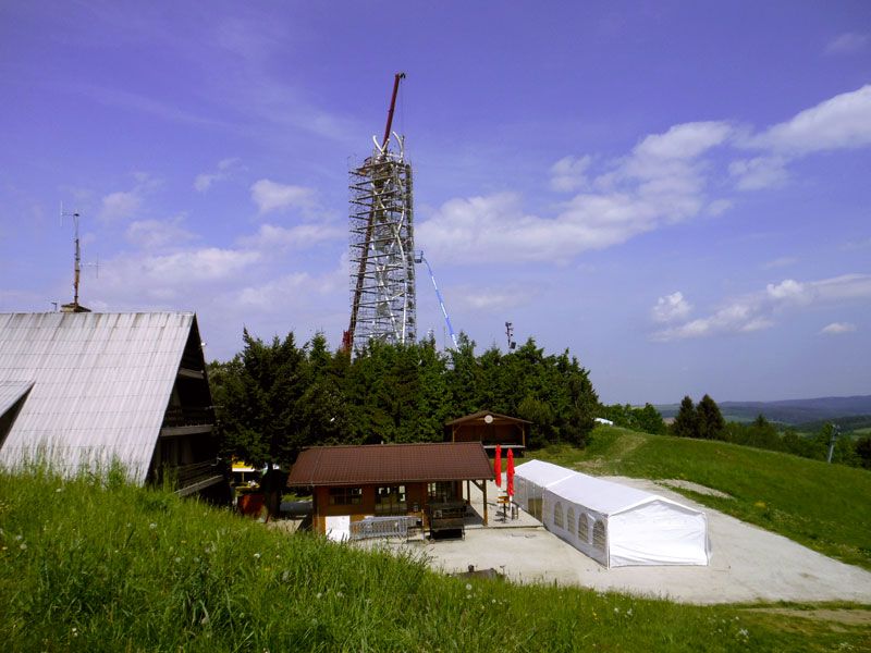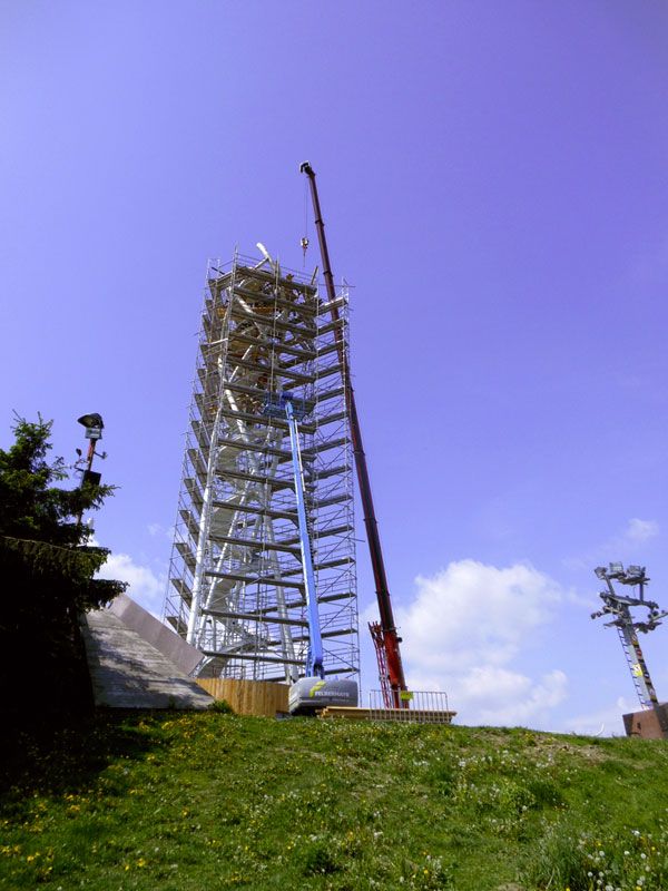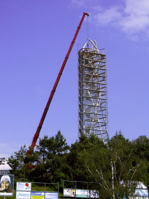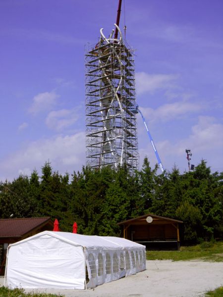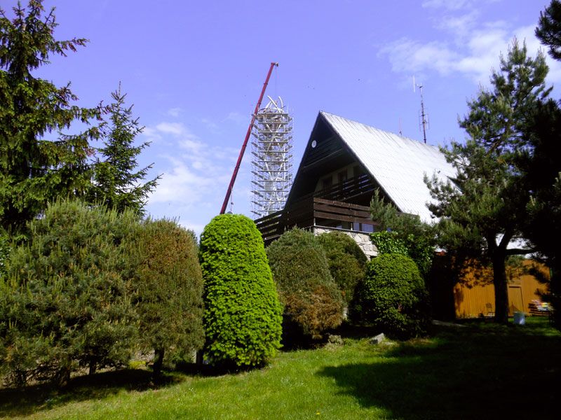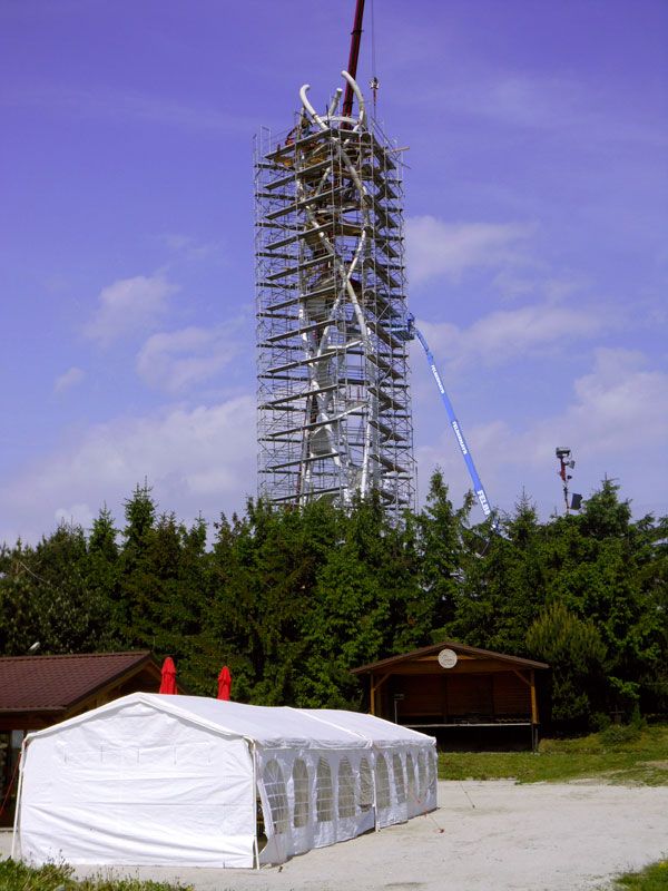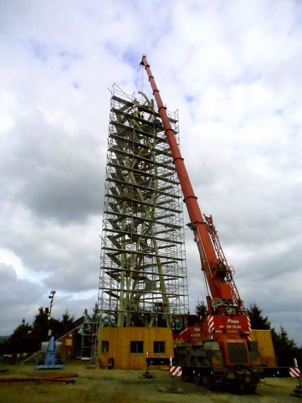 „Rozhlednu jsme chtěli otevřít dříve, nicméně počasí termín odsunulo,“ uvádí předseda Ski klubu Jiří Novotný. Ve výšce přes třicet metrů ve velkém větru nemůže pracovat ani jeřáb, ani lidé. Za deště zase nelze svářet. Počasí tak hodně míchalo kartami. Nyní jsou práce ve fázi, kdy zbývá dokončit povrchové úpravy konstrukce, jež dělají horolezci.