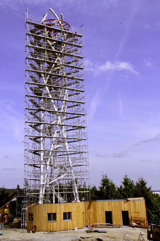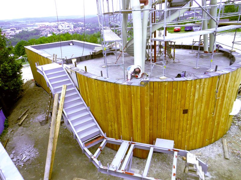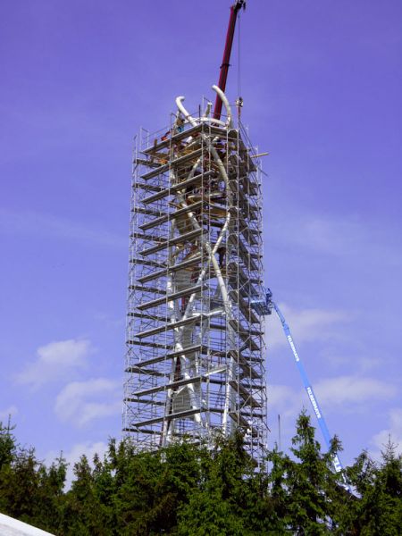 „Složité bylo už samotné zakládání stavby,“ potvrzuje Miroslav Lysý z Atiky, která je hlavním dodavatelem. Podle něj bylo nutné provést úpravy projektu, změnit technologii kvůli podloží, zpracovat dílenský projekt pro montážní firmu atd. Materiál konstrukce byl vyroben na zakázku. Rozhledna stojí na železobetonových pilotech, jež jsou zapuštěny do hloubky 12 až 16 metrů, tedy až pod navážku na původní skálu.