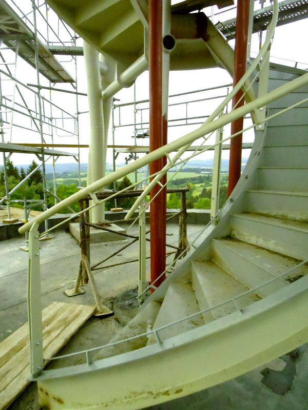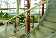 Vřetenovité točité schodiště a podesty jsou z ocelového plechu. Pochozí plochy a nástupnice schodů jsou upraveny stěrkou se vsypem proti skluzu.