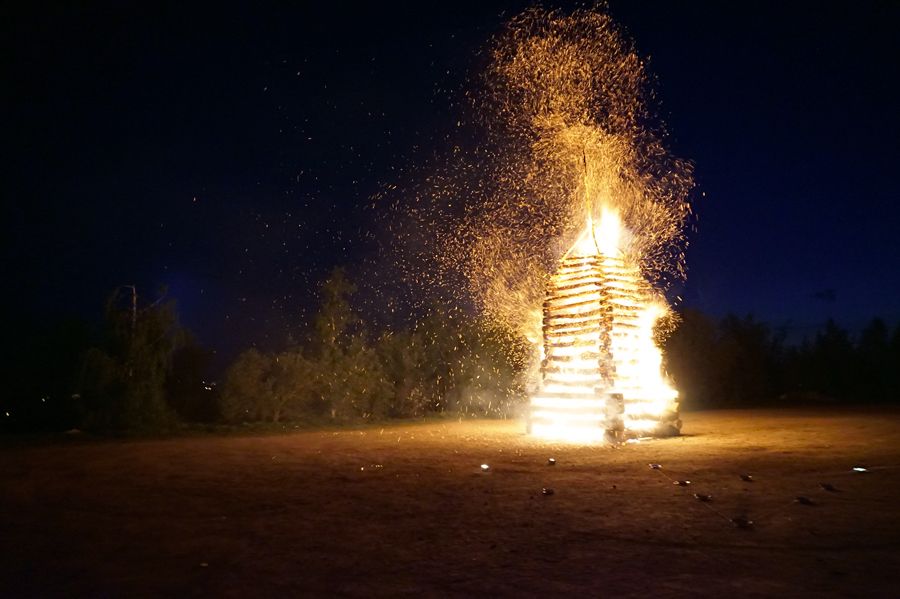 Za přítomnosti starosty Josefa Komínka a radního Františka Komínka místní šermířská skupina TAS sehrála krátké divadlo o osvobození zajatých dětí a následovala velká ohňová show skupiny Sarcina. Členové skupiny se pak ujali i zapálení hlavní hranice. Ta vzplála v ceremoniálu ohňového šamana.