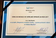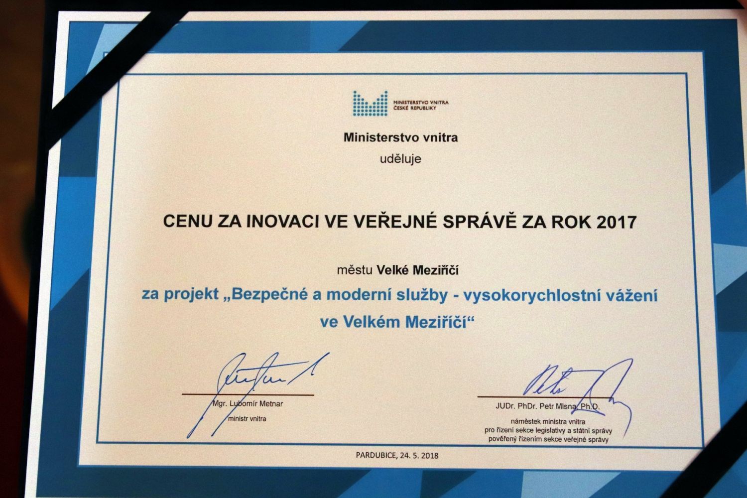 Cenu Ministerstva vnitra ČR udělenou Velkému Meziříčí za inovaci ve veřejné správě převzal starosta Josef Komínek. Město ji dostalo za projekt Bezpečné a moderní služby – vysokorychlostní vážení.