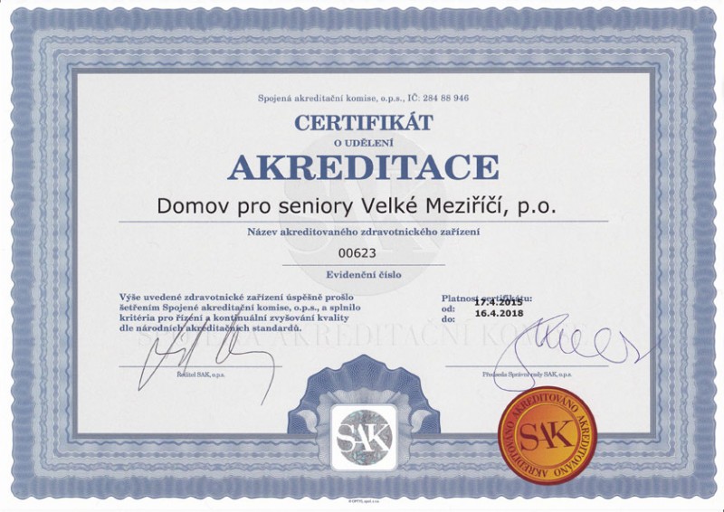 Spojená akreditační komise (SAK) udělovala v ČR donedávna akreditaci pouze zdravotnickým zařízením. Od roku 2014 zahájila pilotní projekt, který tuto možnost nabízí i pobytovým sociálním službám. Domov pro seniory ve Velkém Meziříčí se k akreditaci přihlásil na podzim roku 2014 a po několika měsících příprav v minulých dnech uspěl. Udělení akreditace je pro zařízení vysokým hodnocením kvality a bezpečné zdravotní péče.