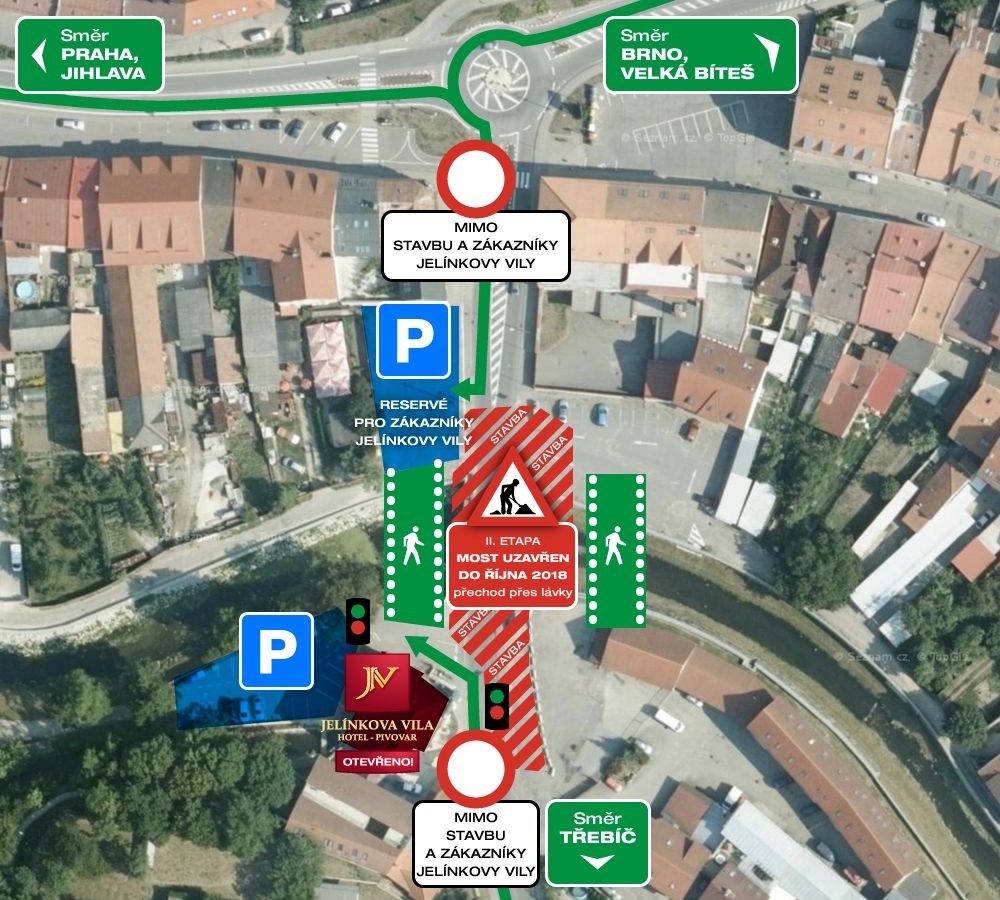- Ze směru Třebíč – tzn. ulicí Třebíčskou – přijedete až k Jelínkově vile. Na hotelové parkoviště je provoz pouze jedním pruhem řízen kyvadlově semaforem.