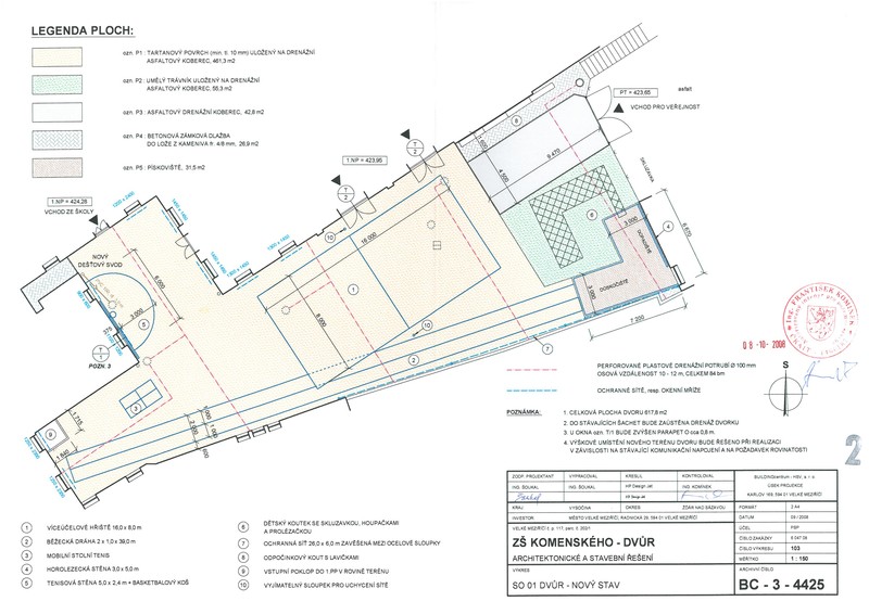 Na dvoře vznikne víceúčelové hřiště 16x8 metrů a běžecká dráha s tartanovým povrchem. K dispozici dětem bude i horolezecká stěna, tenisová stěna s basketbalovým košem, mobilní stolní tenis, dětský koutek se skluzavkou, houpačkami a prolézačkou, jenž bude na umělé trávě, nebo odpočinkový kout s lavičkami.