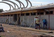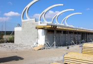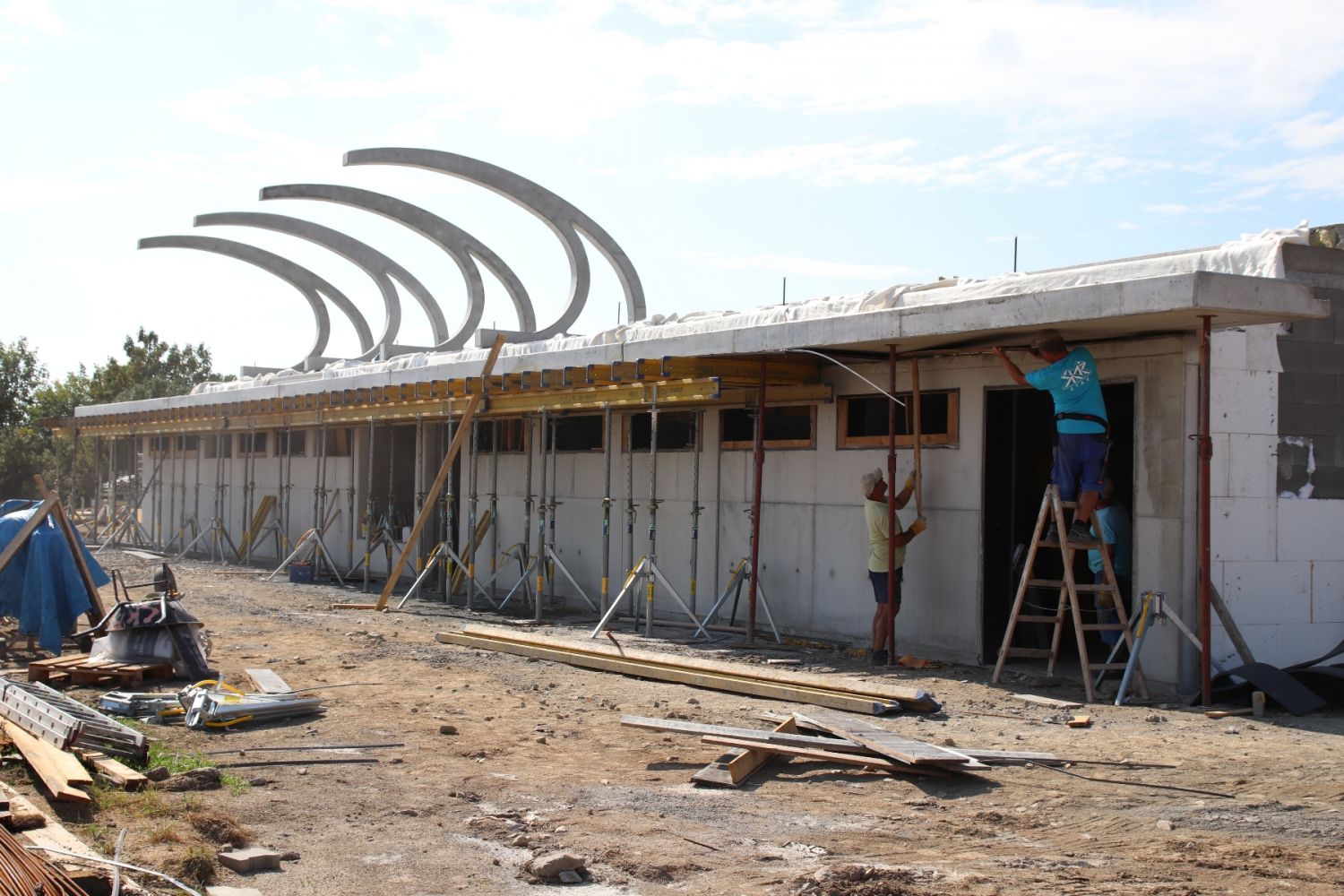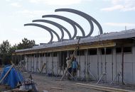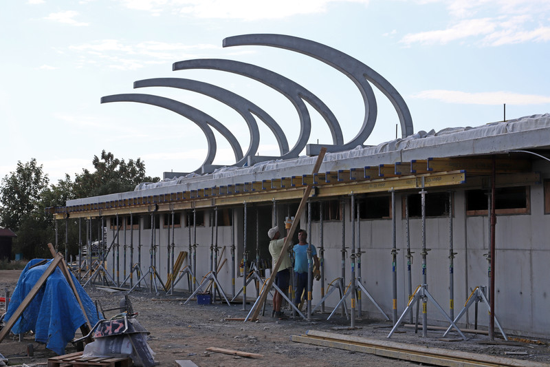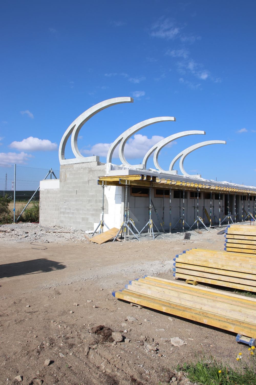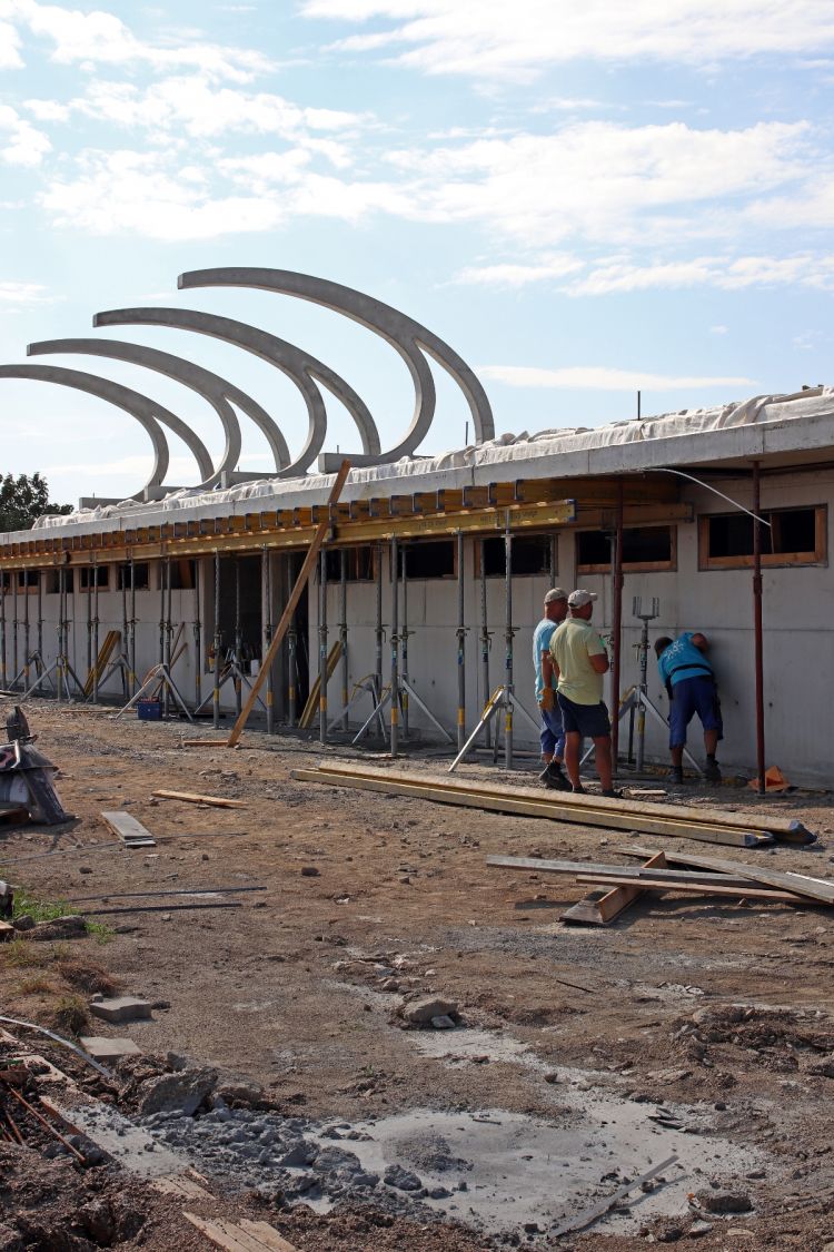 „V současné době je hotová hrubá stavba tribuny. Betonové prefabrikáty nahoře už ukazují její konečný tvar. Na ně přijde ještě polykarbonát a ocelová konstrukce. Také inženýrské sítě jsou z devadesáti procent dokončeny,“ uvedl pro Velkomeziříčsko stavbyvedoucí firmy SKR stav Petr Láníček. Společnost SKR stav zhotovuje i osvětlení areálu. „Kabeláž je připravena, nyní čekáme na stožáry z Anglie. Asi v polovině srpna už by osvětlení mělo fungovat,“ dodal Láníček. Ve finále pak bude firma montovat vlastní konstrukci tribuny a pracovat na interiérech.