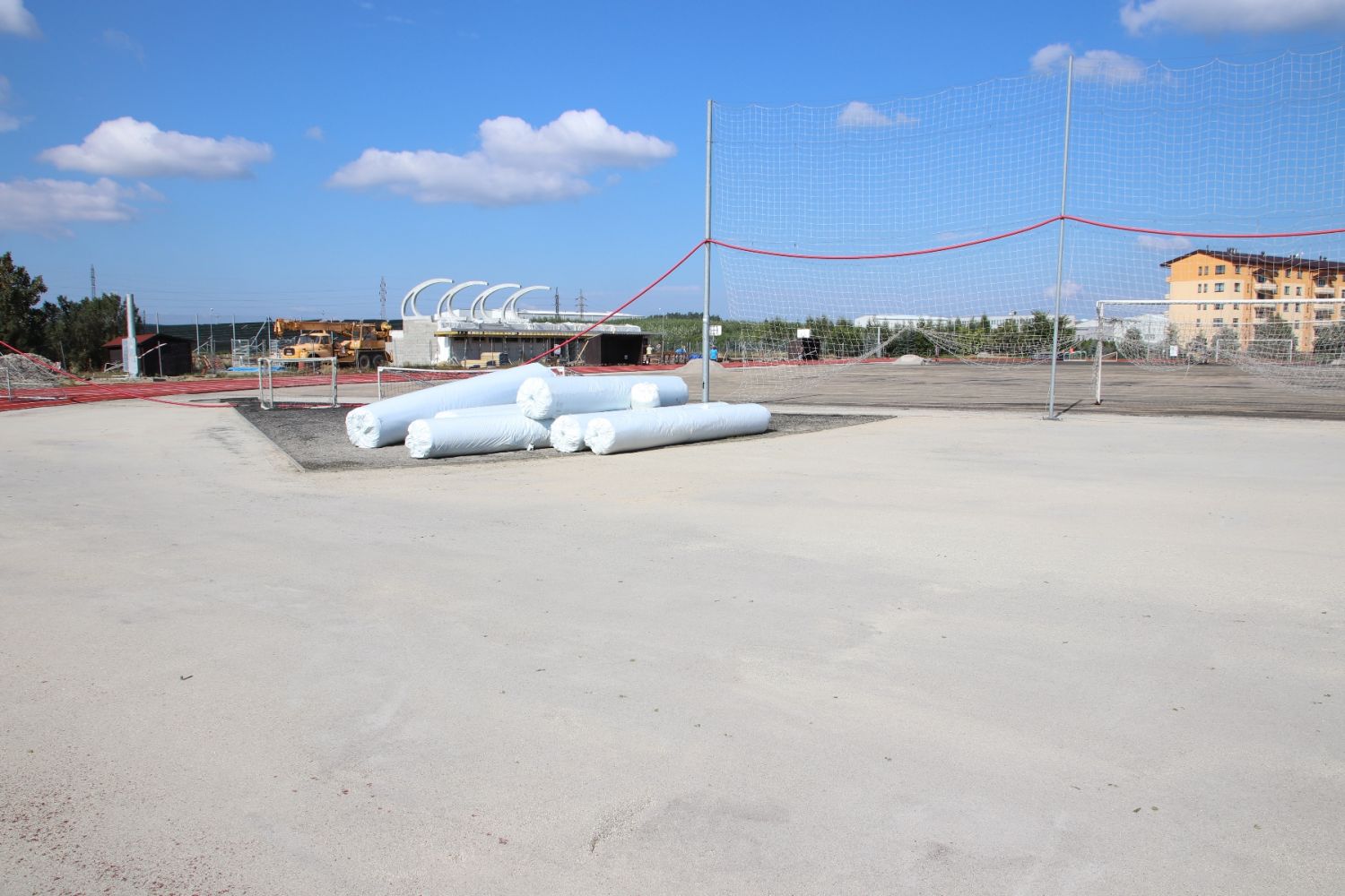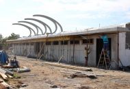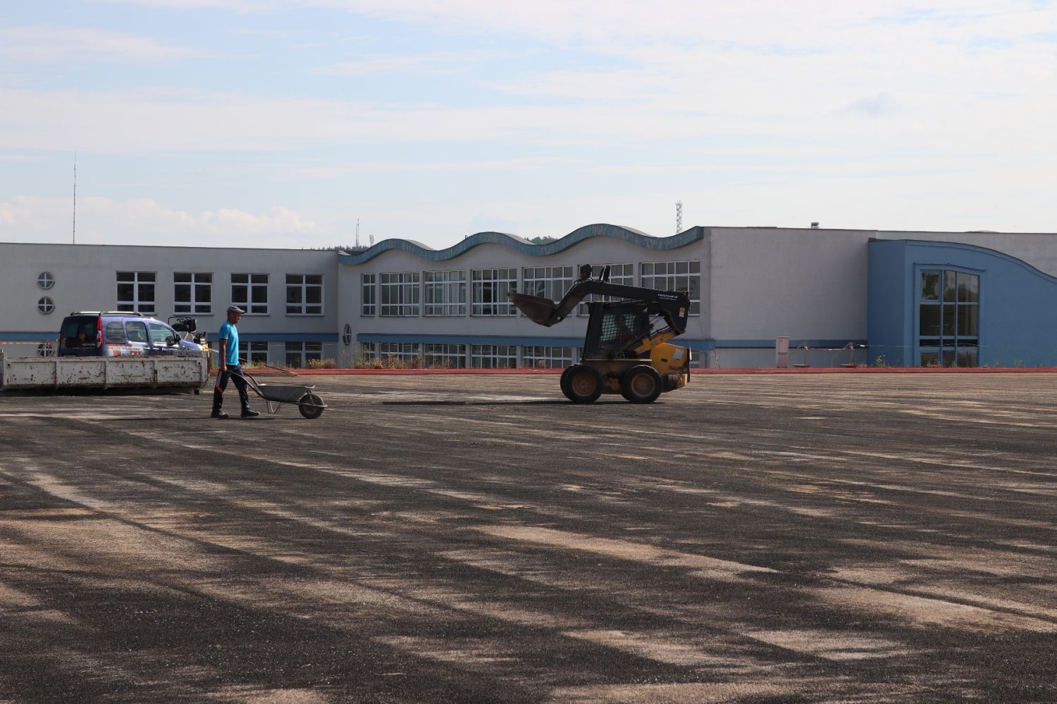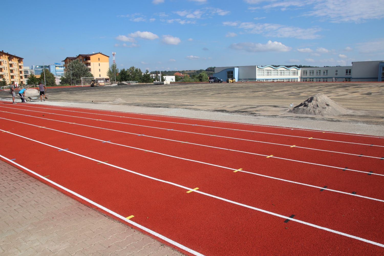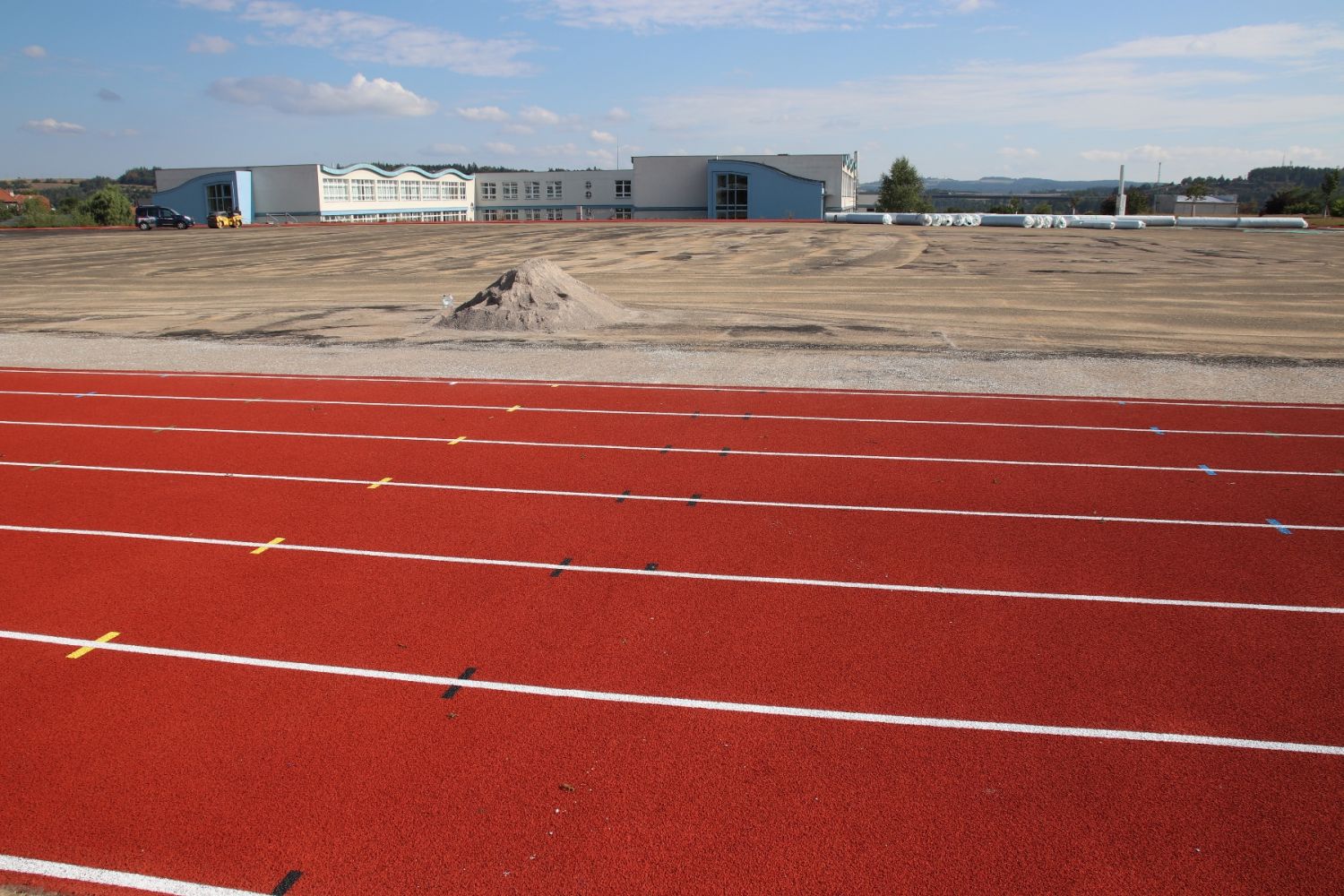 Na sportovišti za Základní školou Školní už stojí hrubá stavba tribuny. Tartanový ovál je opravený, má nastříkaný nový povrch, dochází k výměně umělé trávy.