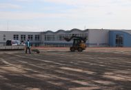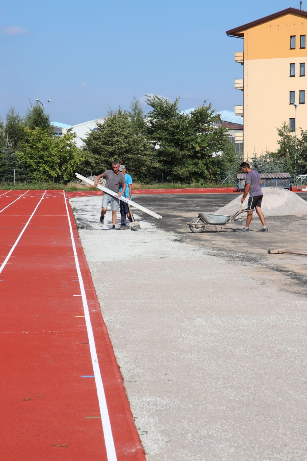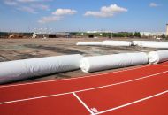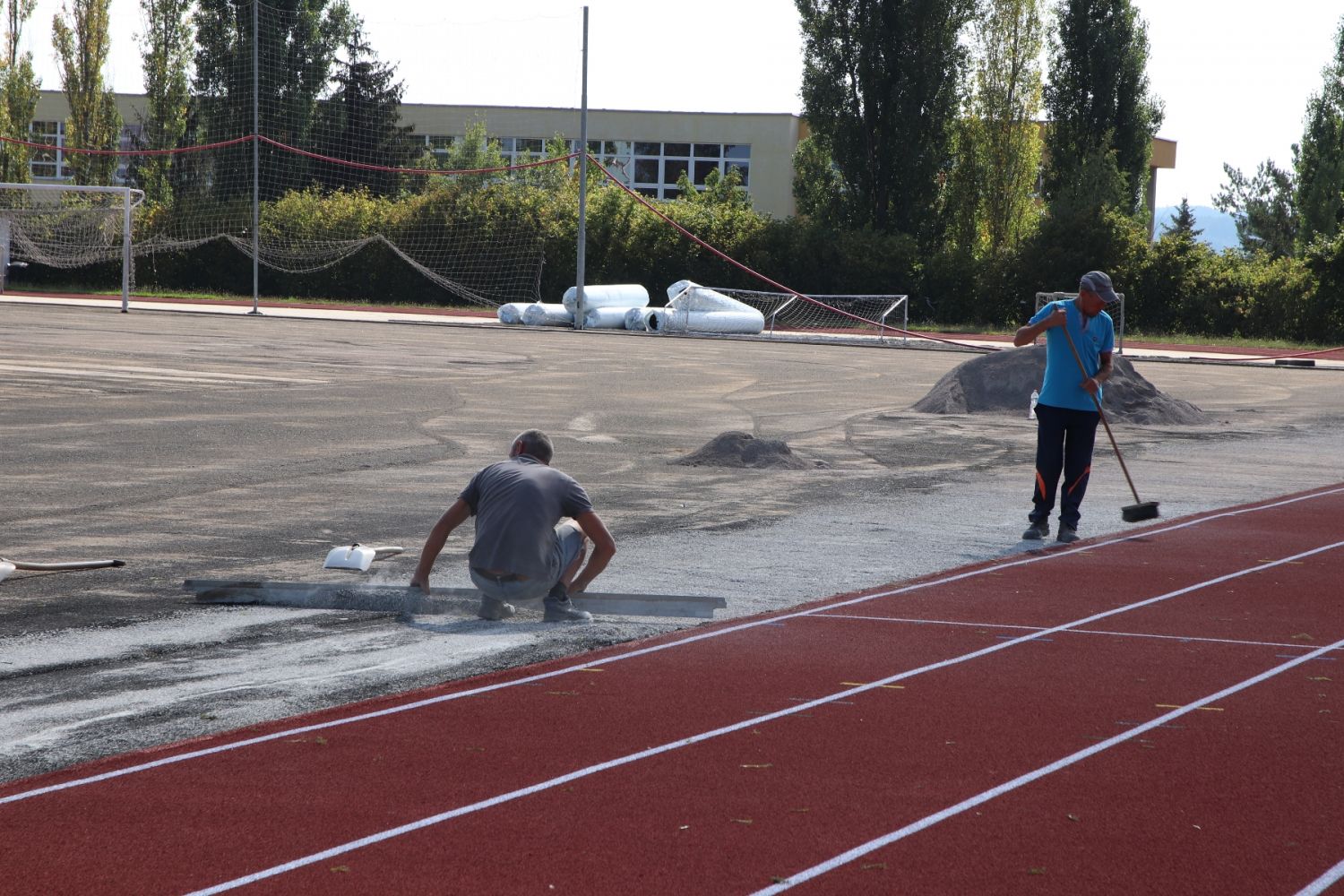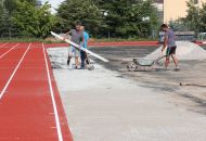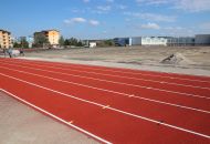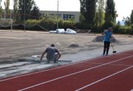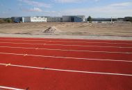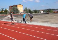 Na atletickém oválu je již opraven tartanový povrch, má nový nástřik. Další firma právě připravuje podklad pro položení nové umělé trávy.
