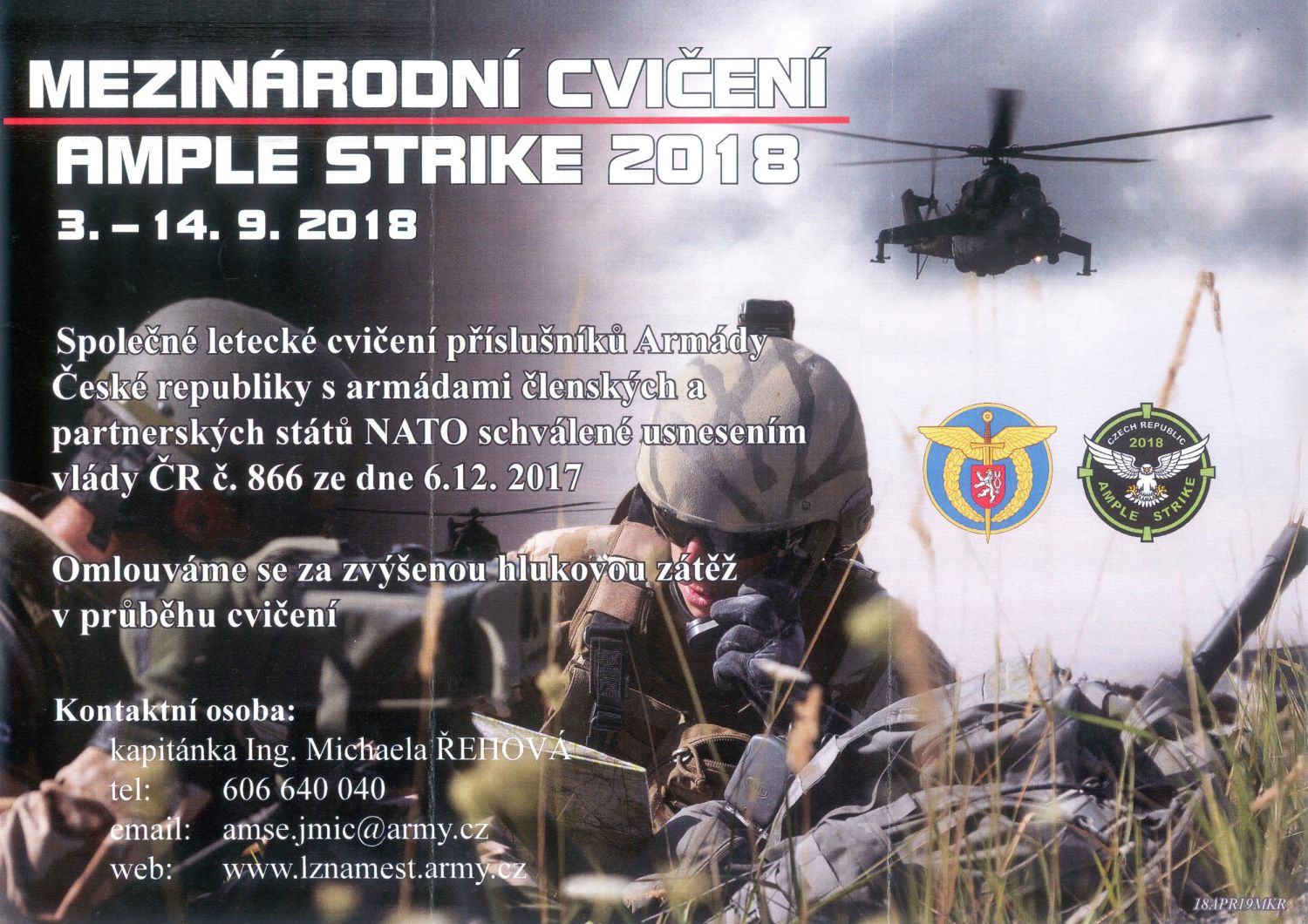 V září se opět uskuteční společné letecké cvičení Ample Strike příslušníků Armády ČR s armádami členských a partnerských států NATO. Vzhledem k tomu, že jedním z hlavních míst cvičení bude základna vrtulníkového letectva Sedlec, Vícenice u Náměstě nad Oslavou, zvýšená hluková zátěž se dotkne i obyvatel Velkomeziříčska. Starostovi města to oznámil velitel vzdušných sil, brigádní generál Petr Hromek.