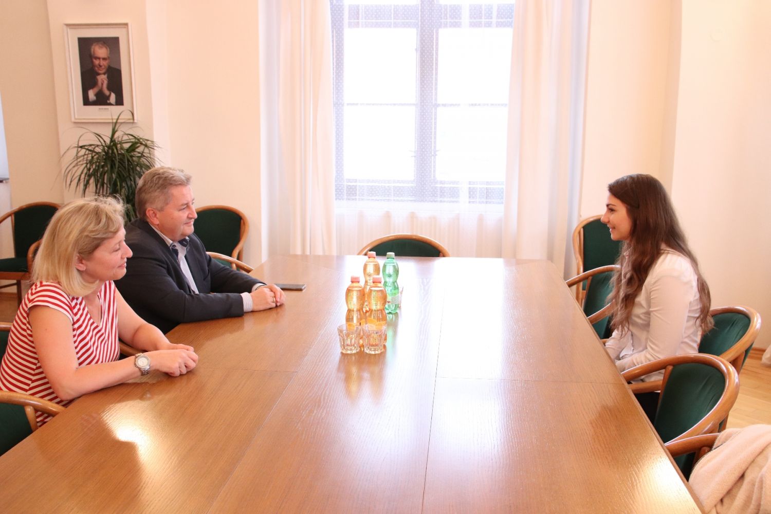 „Vážíme se takových talentů, jako jste vy,“ přivítal ji starosta Josef Komínek a zajímal se o průběh soutěže a další podrobnosti.