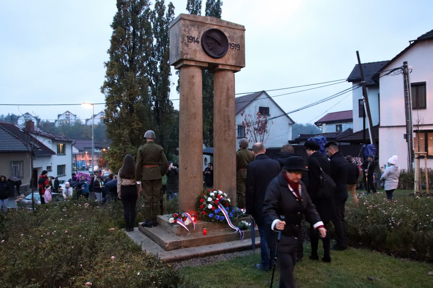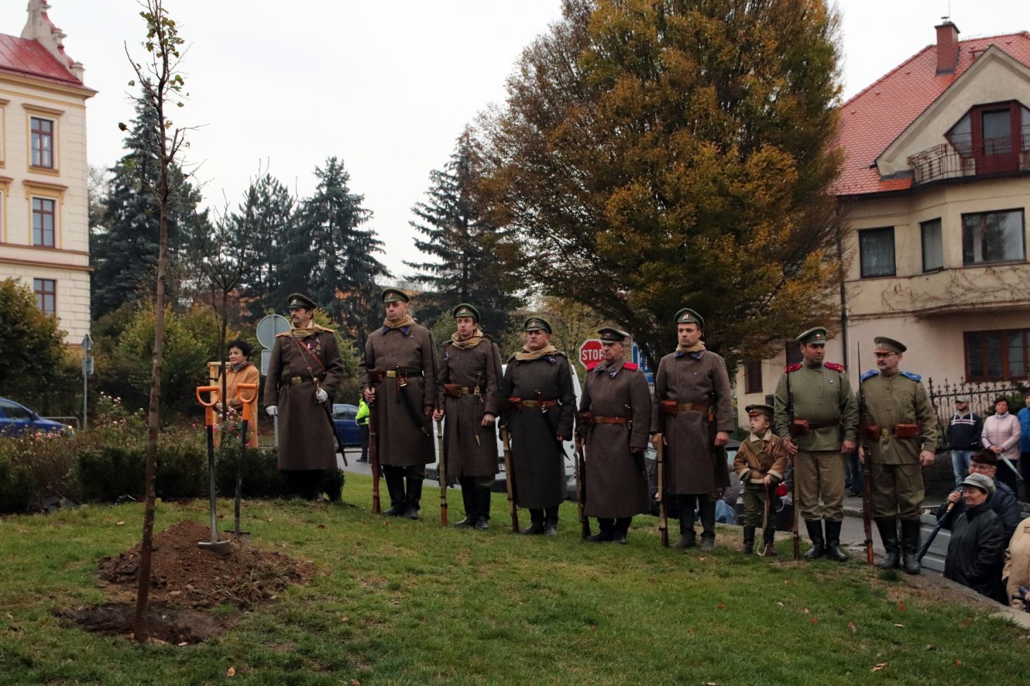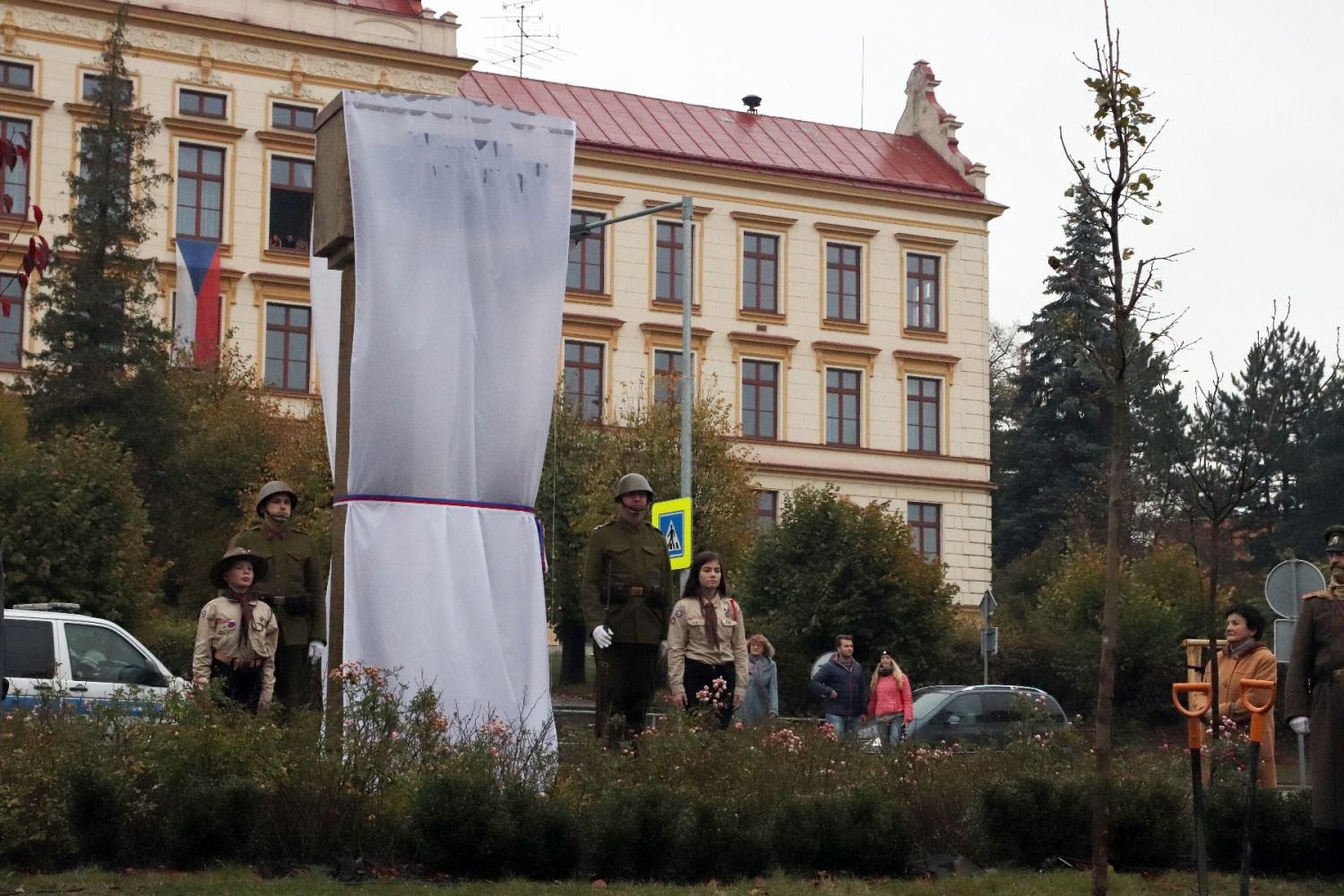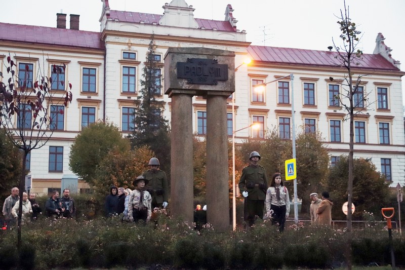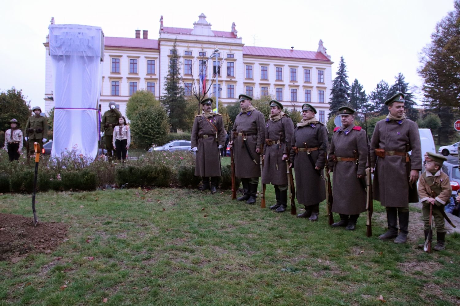 Neděle 28. října 2018, u pomníku naproti gymnáziu stojí čestná stráž vojáků historické jednotky i skauti, kolem davy lidí. Přišli oslavit 100 let republiky a uctít památku padlých.