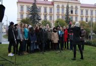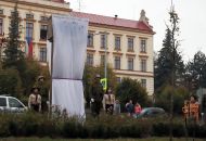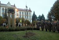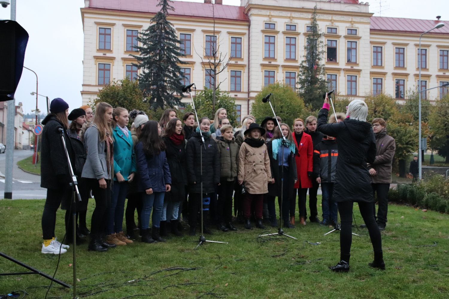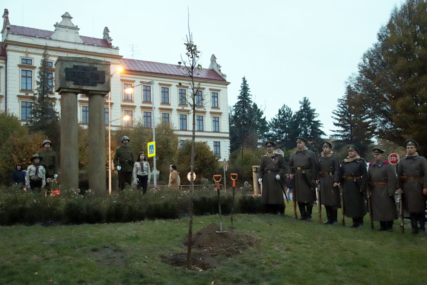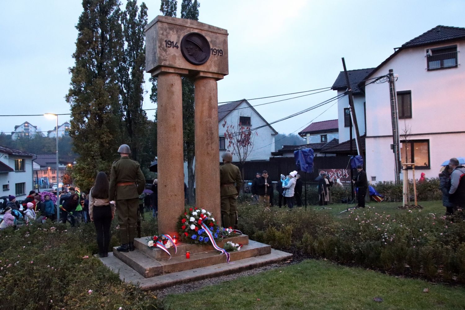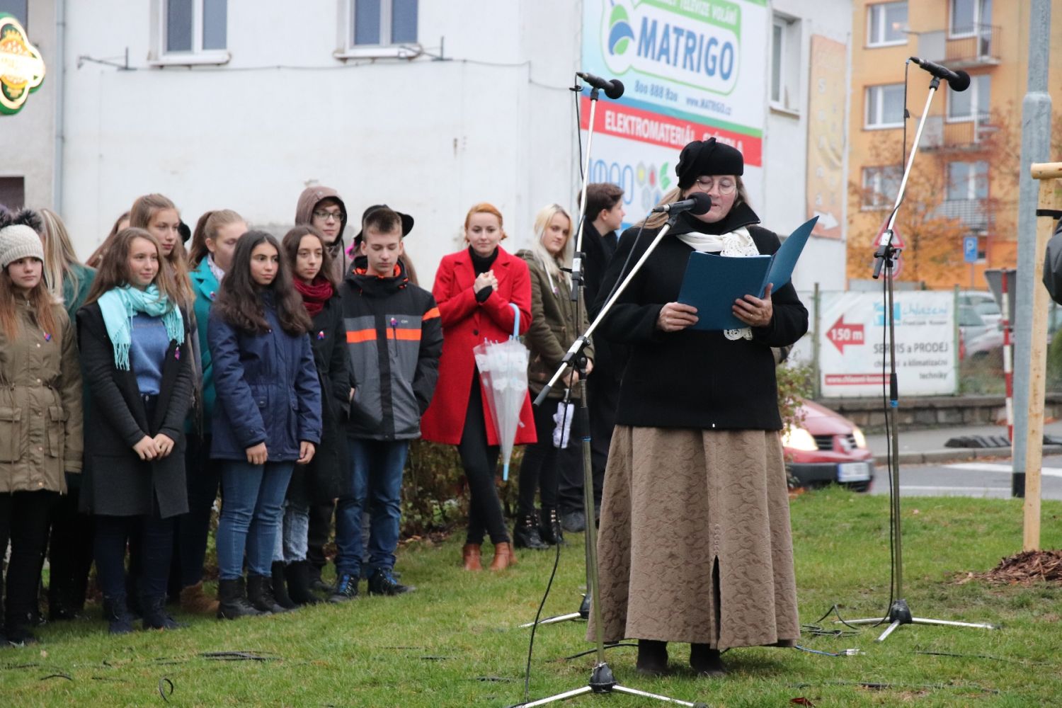 Neděle 28. října 2018, u pomníku naproti gymnáziu stojí čestná stráž vojáků historické jednotky i skauti, kolem davy lidí. Přišli oslavit 100 let republiky a uctít památku padlých.