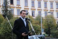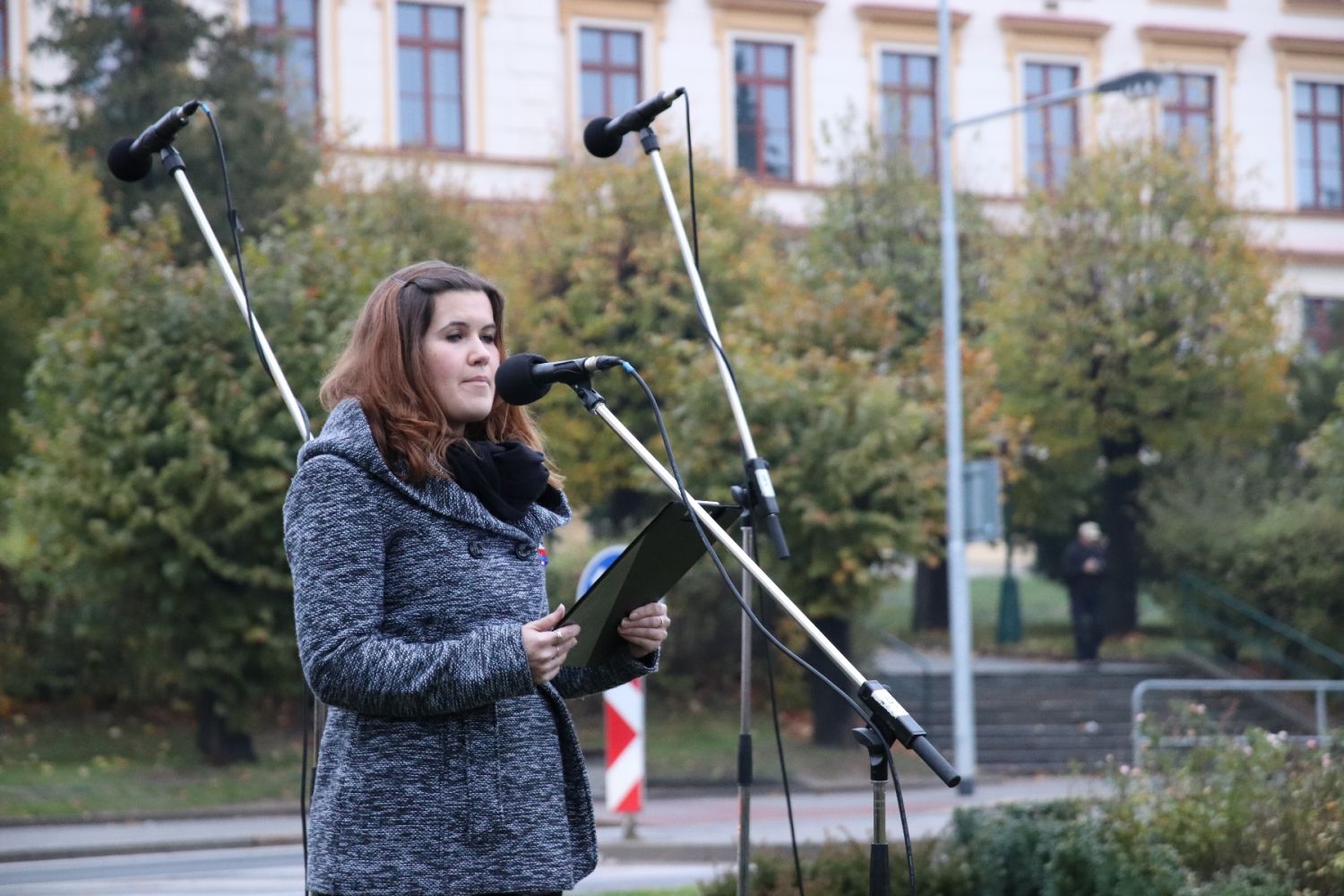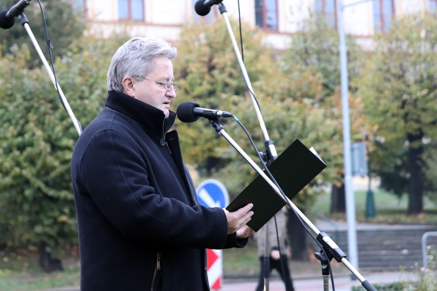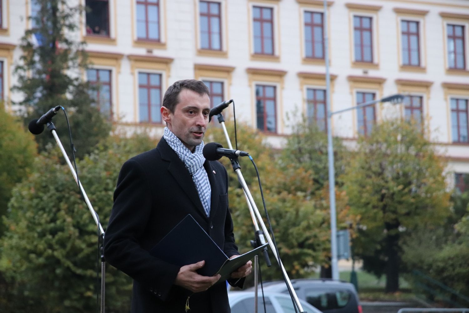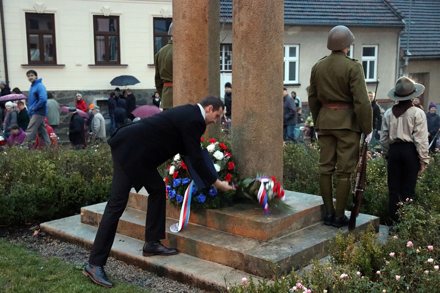 Starosta města Josef Komínek přítomné na pietním místě přivítal. „Před sto lety zaznívaly poslední výstřely první světové války. Přišel konec rakousko-uherské monarchie a začátek nového samostatného státu. Po dvaceti letech budování demokratické Masarykovy a Benešovy první Československé republiky přišlo desetileté období ohraničené tragickými roky spojené číslovkou osm. Roky, které byly počátkem dvou totalitních režimů. Tato období přinesla mnoho obětí i z řad našich obyvatel,“ řekl Josef Komínek a jmenoval dva občany Velkého Meziříčí, jejichž osudy byly spojeny s lety 1938 a 1948. Jedním byl bývalý ruský legionář, plukovník generálního štábu Jiří Jaroš, oběť nacistického režimu, a druhým předválečný místostarosta a poválečný předseda městského národního výboru ve Velkém Meziříčí Jakub Drápela, oběť komunistického režimu.
