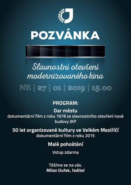 Modernizované kino Jupiter clubu se v neděli 27. ledna slavnostně otevře divákům. Program začne v 15 hodin promítnutím dokumentárního filmu z roku 1978 o otevření nové budovy tehdejšího JKP, následovat bude další dokument o 50 letech organizované kultury ve Velkém Meziříčí a zakončí ho předpremiéra českého filmu Ženy v běhu od 18.30.