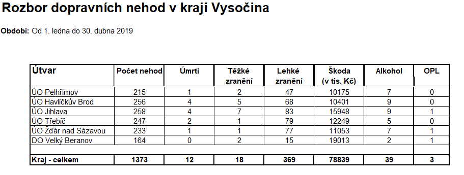 Letošní dopravní nehody si vyžádaly již dvanáct obětí. Loni zemřelo za první čtyři měsíce roku sedm osob. Celkem 18 účastníků se při letošních nehodách těžce zranilo, což představuje ve srovnání se stejným obdobím loňského roku pokles o 36 procent. Dalších 369 účastníků utrpělo při letošních nehodách lehké zranění. Toto číslo je ve srovnání s počtem lehce zraněných za leden až duben roku 2018 o 15 procent nižší. Hmotná škoda na havarovaných vozidlech a ostatním majetku se vyšplhala na částku převyšující 78 839 000 korun a ve srovnání se stejným obdobím roku 2018 je o 12 procent nižší. Ve 42 případech policisté při šetření nehody zjistili, že řidič před jízdou požil alkoholické nápoje nebo byl pod vlivem omamných a psychotropních látek. Počet podnapilých řidičů, kteří havarovali, se sice meziročně snížil, a to o 22 procent. Policisté v letošním roce ale dokumentují i několik dopravních nehod, kdy řidiči, kteří s vozidlem havarovali, usedli za volant v silně podnapilém stavu, kdy výjimkou nebyly hodnoty přesahující tři promile alkoholu.