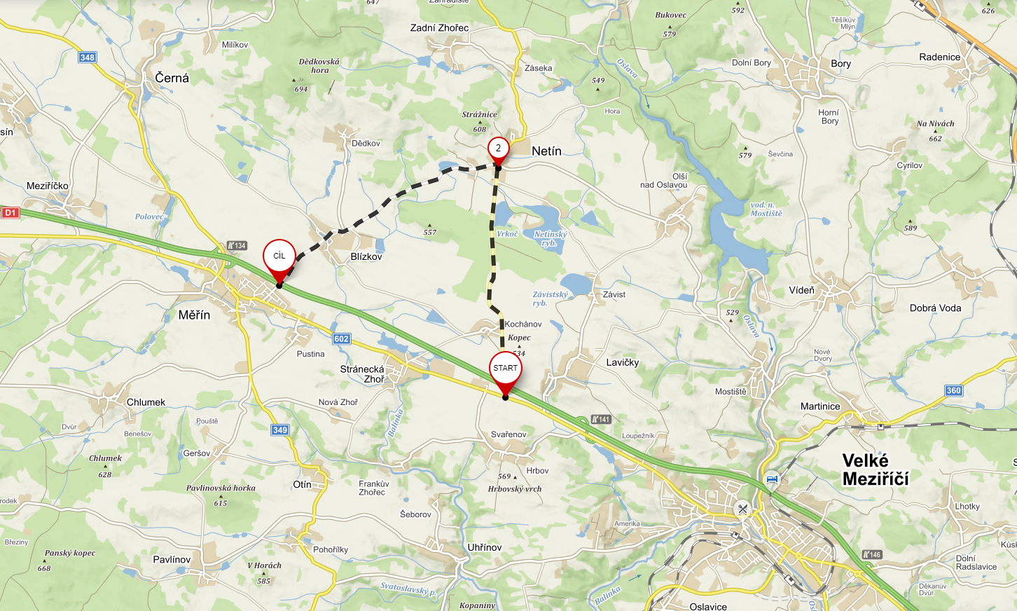 • II/602 – D1 EXIT 141 Velké Meziříčí západ – D1 EXIT 134 Měřín, II/348, II/602 (pro vozidla splňující podmínky pro jízdu na dálnici)