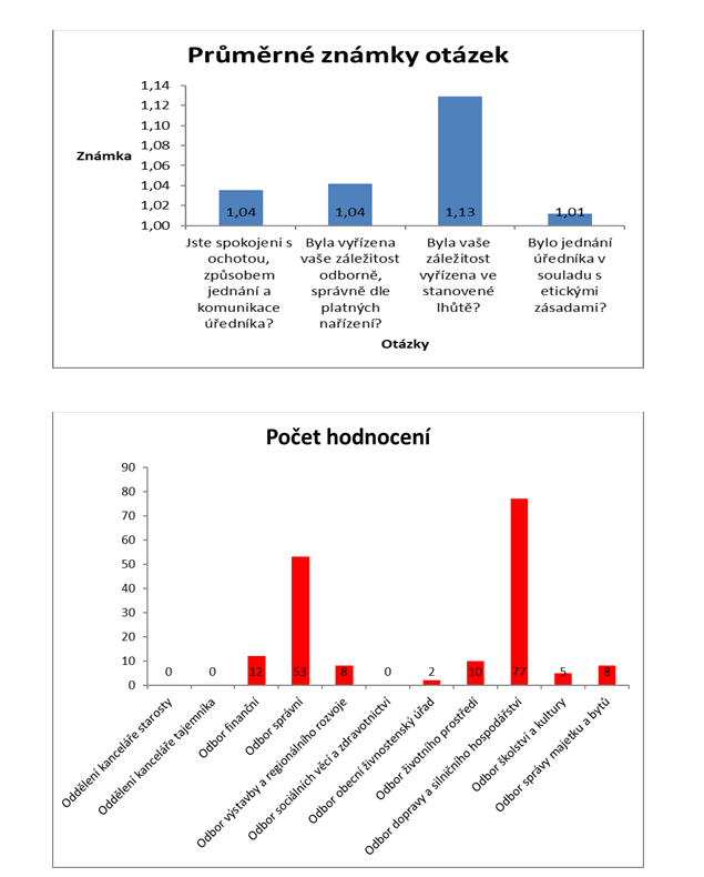 2) Nejvíce počet hodnocení obdržel odbor dopravy a silničního hospodářství (77). Nejméně pak oddělení kanceláře starosty (0), oddělení kanceláře tajemníka (0) a odbor sociálních věcí a zdravotnictví (0).