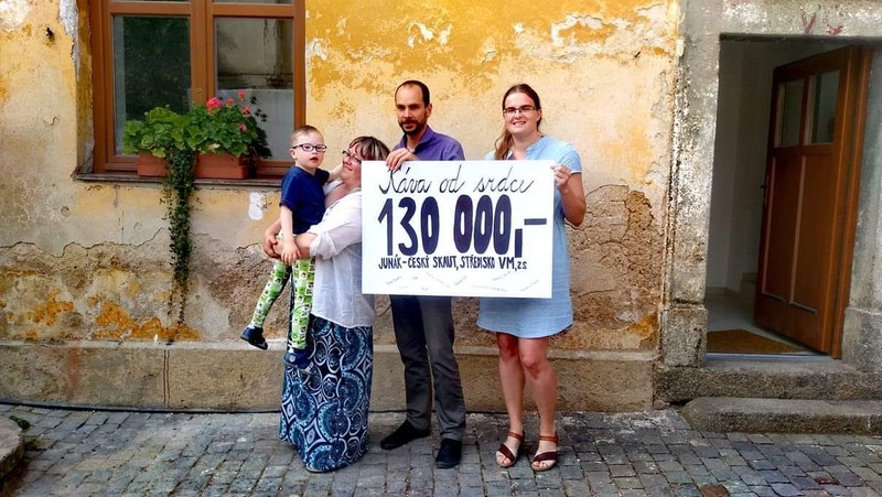 Skauti z Velkého Meziříčí zorganizovali již druhý ročník dobročinné Kavárny od srdce, který proběhl na faře v pouťový víkend 14. - 16. června. Hned v pondělí s nadšením předali výtěžek 130 000,- službě Raná péče, která pomáhá rodinám s hendikepovanými dětmi a paní Čermákové, která má v plánu vydat knihu o životě s dítětem s Downovým syndromem.