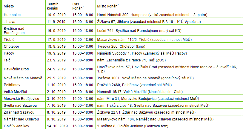 Občané, kteří mají zájem získat informace o podrobnostech výzvy, či zkonzultovat svoje konkrétní dotazy mají možnost obrátit se na linku poskytovatele dotace 564 602 888 nebo své dotazy zaslat na Tato e-mailová adresa je chráněna před spamboty. Pro její zobrazení musíte mít povolen Javascript. . Rovněž je možné navštívit stránky www.kr-vysocina.cz/kotliky, kde jsou aktuální informace průběžně zveřejňovány. V době od 10. září 2019 do 14. října 2019 pak proběhnou informační semináře ve všech obcích s rozšířenou působností. Přesný harmonogram těchto seminářů pro veřejnost je následující: