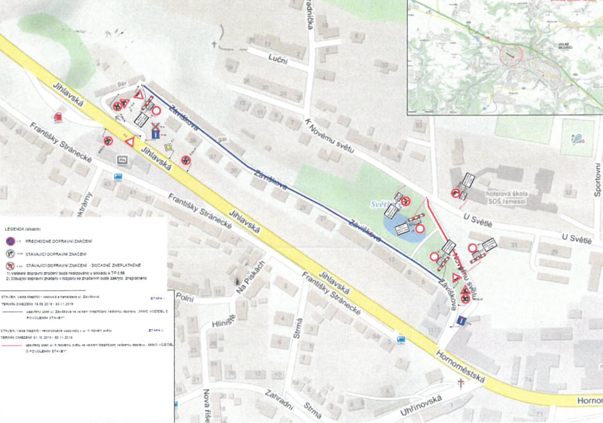 Městský úřad Velké Meziříčí odbor dopravy a silničního hospodářství stanovil přechodnou úpravu provozu na komunikaci K Novému světu. Důvodem dopravního omezení je stavba vodovodu a kanalizace. K nadále trvající uzavírce ulice Záviškova se přidá uzavírka místní komunikace K Novému světu. Úplná uzavírka začne 1. října 2019 a dokončení stavebních prací je plánované na 30. listopadu 2019.