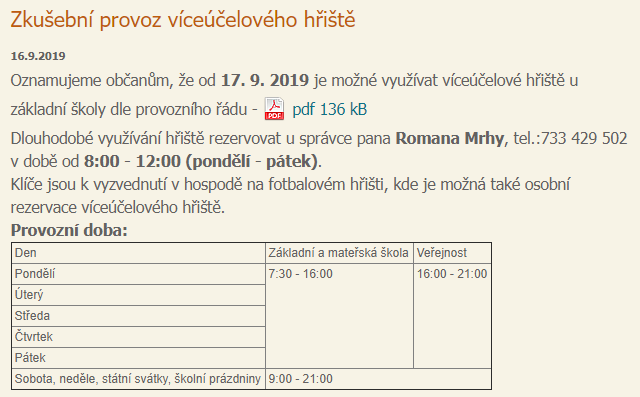 Hřiště lemuje kvalitní osvětlení, které zhotovitel osadil dle projektu, a tak sportovci nejsou limitovaní přírodními světelnými podmínkami. Občané z řad veřejnosti mohou plochu využívat v době od pondělí do pátku od 16 do 21 hodin a o víkendech, státních svátcích i prázdninách vždy od 9 do 21 hodin. Starosta městyse Křižanov Ivo Klimeš uvedl: „Otevírací doba je aktuálně ve zkušebním provozu, abychom věděli, jaký je zájem a co vše k provozu pro veřejnost bude ještě třeba zajistit."