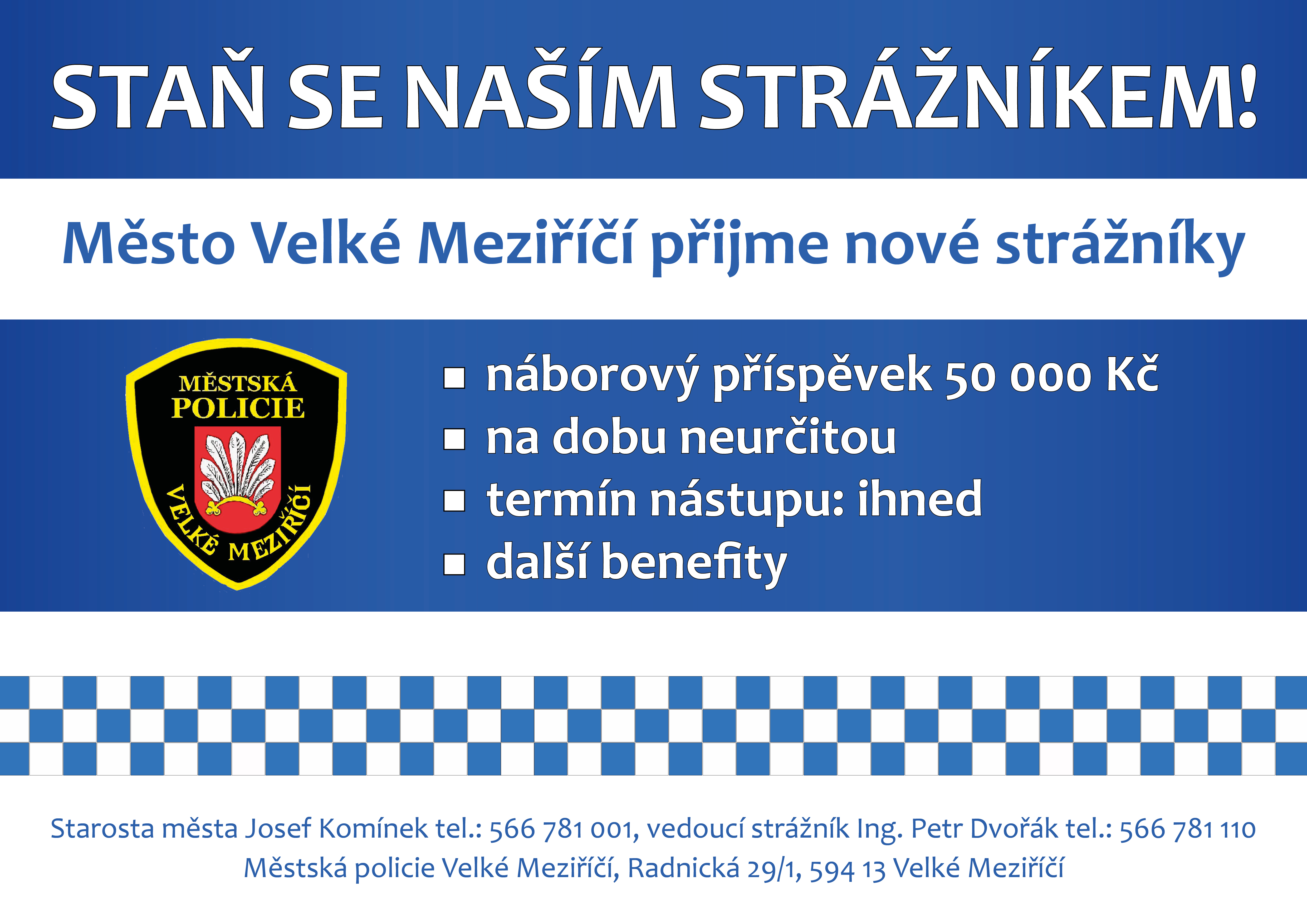 Město Velké Meziříčí schválilo prostřednictvím zasedání rady města náborový příspěvek, který má za cíl motivovat budoucí uchazeče a zatraktivnit práci u městské policie. „Mimo náborový příspěvek strážníci získají i pravidelné benefity ve formě příspěvku na důchodové připojištění, stravenek a dalších. Bonusem je práce v prostorách nové služebny městské policie se širokým zázemím pro naše zaměstnance," řekl vedoucí strážník Petr Dvořák.