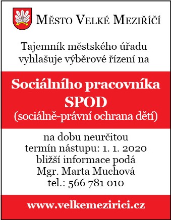 Tajemník Městského úřadu Velké Meziříčí vyhlašuje výběrové řízení na sociálního pracovníka SPOD (sociálně právní ochrany dětí).