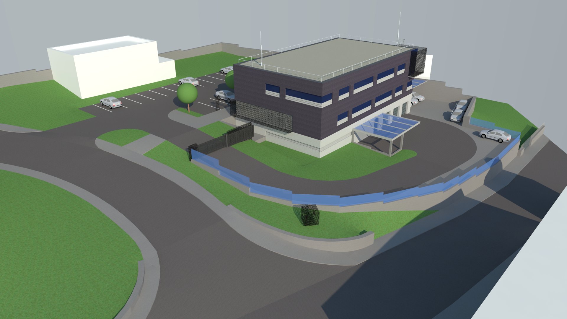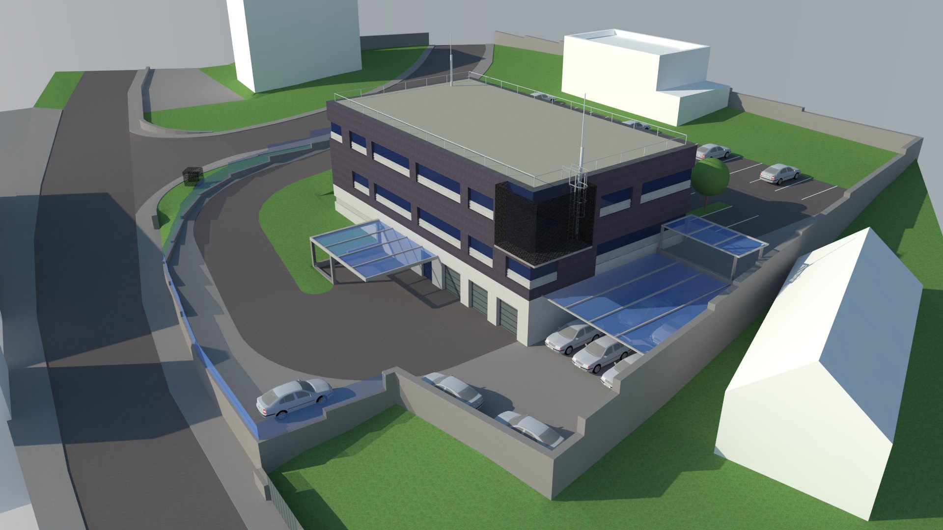 Jak vyplývá z projektové dokumentace, kompozice prostorového řešení nové budovy je zásadně ovlivněna záměrem vytvořit optimální podmínky pro fungování provozu policie. Proto jsou využity možnosti, které poskytuje svažitý pozemek. Na optimální míru jsou vyladěny podélné sklony komunikací z důvodu omezení zimní údržby na minimum. Záměrem je realizovat budovu se vztahem k městskému centru, a to z hlediska celkového architektonického vyznění. S tím souvisí záměr rozšíření centrální části města. Materiálové řešení je charakteristické použitím zavěšeného, provětrávaného lehkého obvodového pláště ve dvou nadzemních podlažích. Součástí architektonického řešení okolí stavby jsou opěrné zdi s atypickým oplocením na hranici pozemku.