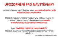 Prosíme všechny návštěvníky, aby v maximálně možné míře omezili návštěvy domova. Žádáme všechny, kteří se v nedávném období vrátili ze zahraničí, aby před návštěvou domova dodrželi doporučenou dvoutýdenní karanténu. Dále zavádíme domovní knihu návštěv. Prosíme o zapsání všech příchozích dle pokynů v knize návštěv.