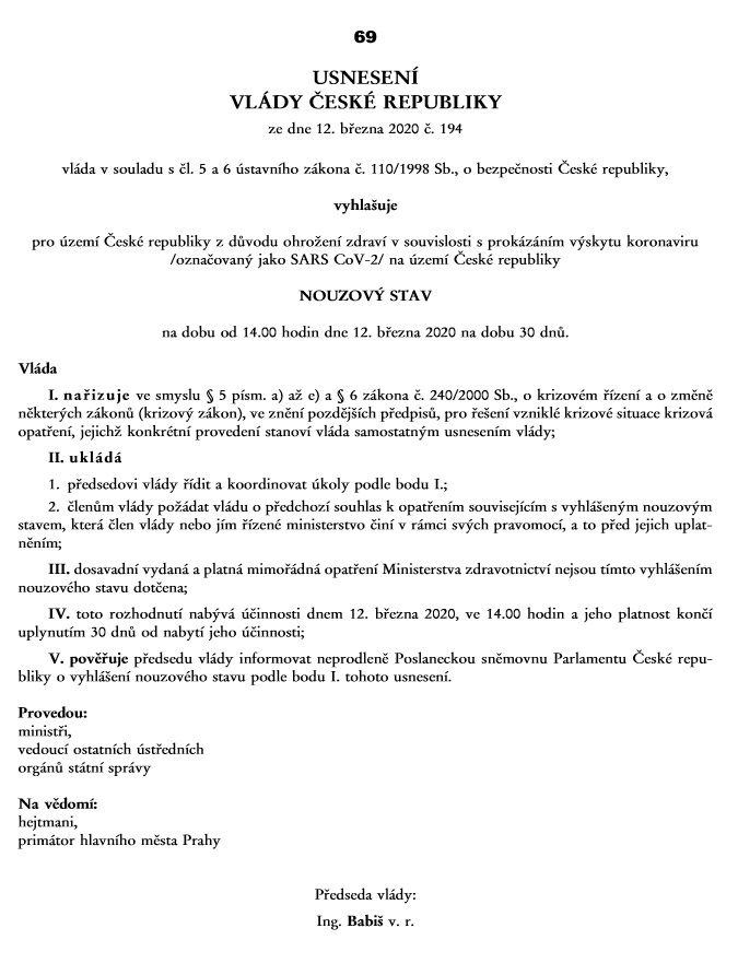 Vláda dnes vyhlásila kvůli výskytu koronaviru na 30 dnů nouzový stav na celém území České republiky. Začal platit od dnešních 14:00. Důvodem je ohrožení zdraví obyvatel. Na tiskové konferenci to po mimořádném zasedání vlády řekl premiér Andrej Babiš (ANO). Návrh na vyhlášení nouzového stavu před jednáním kabinetu avizoval ministr vnitra Jan Hamáček (ČSSD).