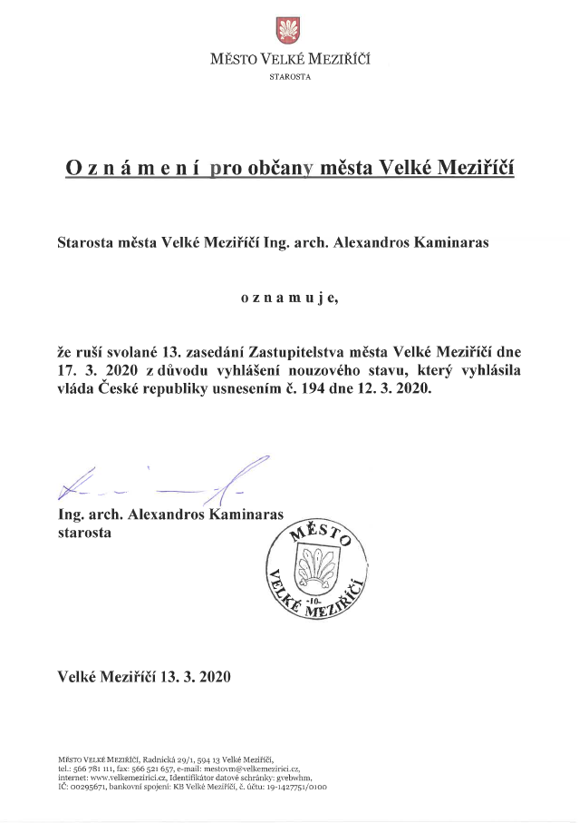 Z důvodu vyhlášení nouzového stavu a zavedení bezpečnostních opatření proti šíření viru Covid-19 ruší starosta města Alexandros Kaminaras svolané 13. zasedání Zastupitelstva města Velké Meziříčí na 17. března 2020.