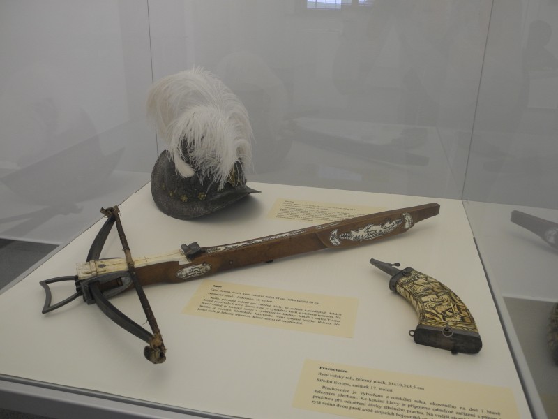 Nechybí ani ukázka ze sbírky skla a porcelánu či fondu zbraní. Tento fond na výstavě zastupuje lovecká kuše ze šestnáctého století, která je vykládaná kostí.
