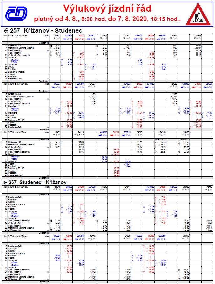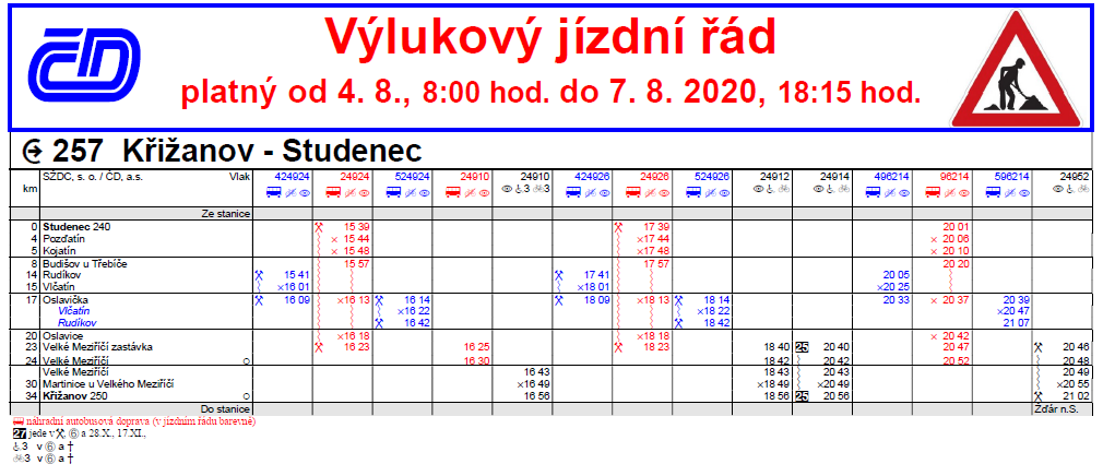 Autobusové spoje jedou z důvodu silniční uzavírky mimo Rudíkov a Vlčatín. Pro obsluhu těchto zastávek zavádí České dráhy kyvadlovou linku Oslavička – Vlčatín – Rudíkov(zastávka Rudíkov, rozc. Hroznatín) a opačně. Ve výlukovém jízdním řádu naleznete změnu vyznačenou modře. V Oslavičce pak dráhy zajistí přestup mezi linkami.