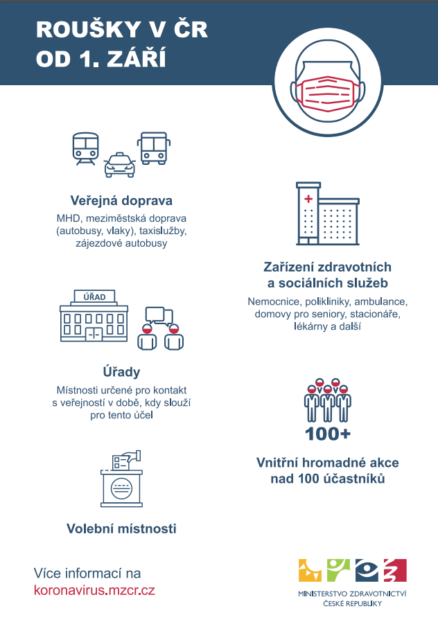 Ministerstvo zdravotnictví na základě doporučení epidemiologů od 1. září 2020 opět zavádí povinné nošení roušek v hromadné dopravě, na úřadech a ve zdravotnických a sociálních zařízeních. Nutné budou také u říjnových krajských a senátních voleb. Naopak nebudou povinné ve školách, obchodech, restauracích nebo například v kadeřnictvích. Lidé je podle nových pravidel nosit musí, jen když bude v regionu vyšší riziko nákazy nemocí covid-19.