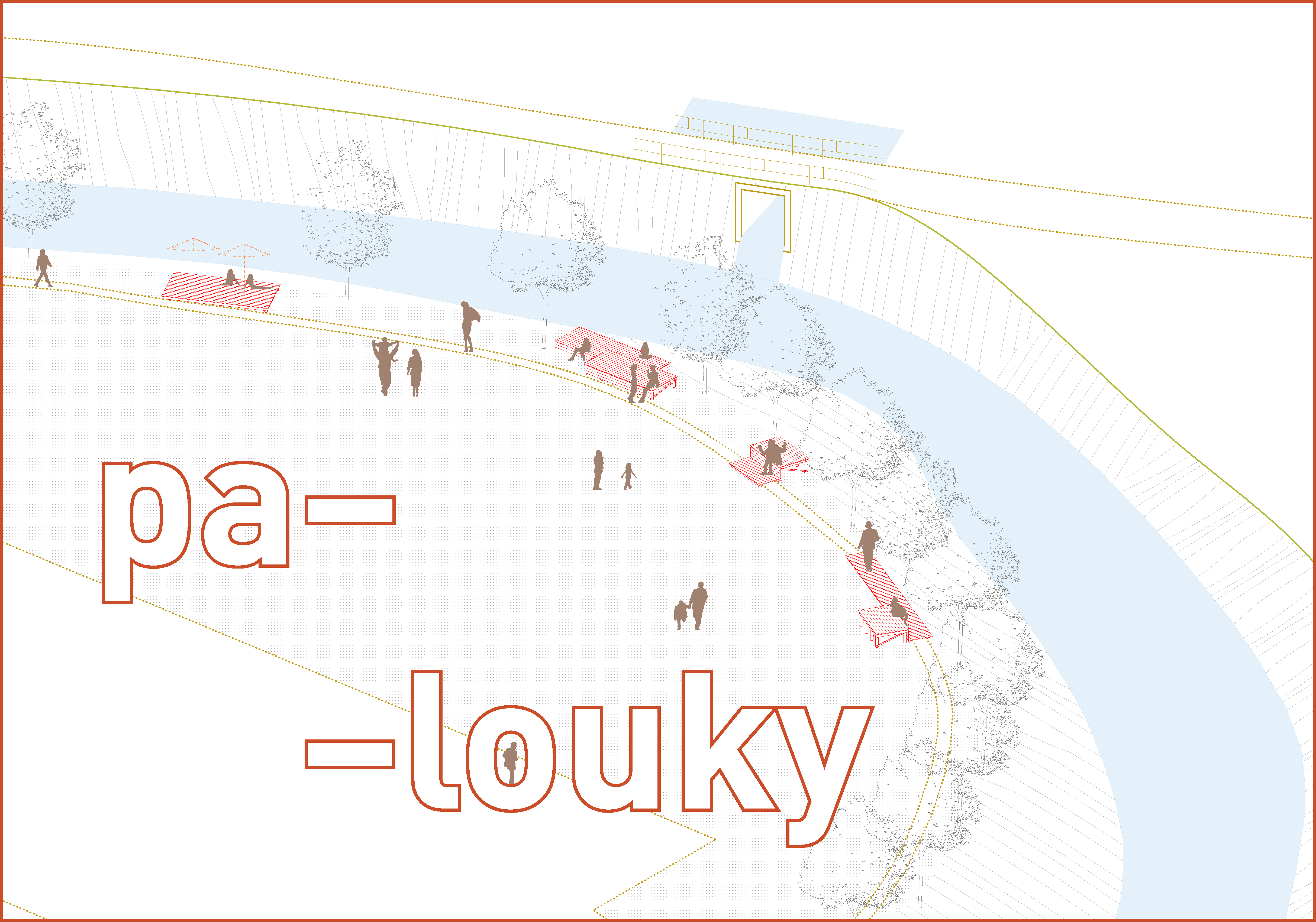 Pokusíme se oživit prostor mezi Balinkou a protipovodňovou zdí. Objevujeme prošlapanou pěšinku kolem plynoucí vody, která si po velkých deštích neohroženě razí cestu širším korytem, hučící přepad bývalého mlýnského náhonu i tichou louku s javory lemujícími břeh řeky. Palouky.