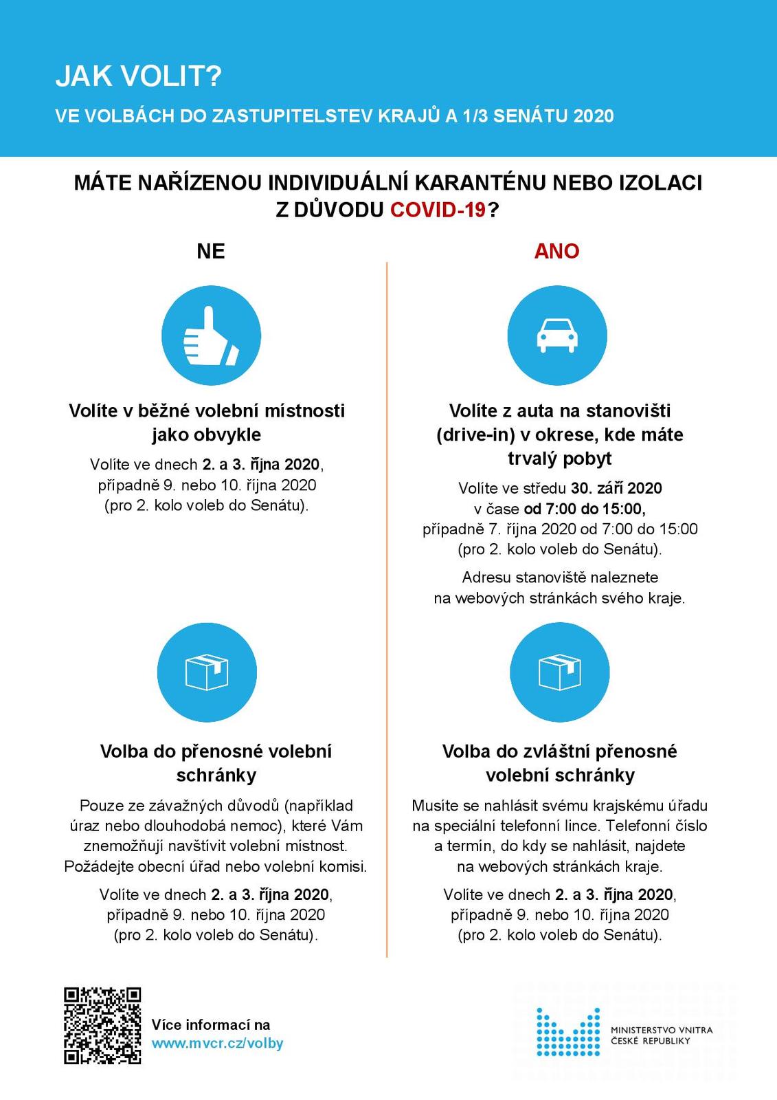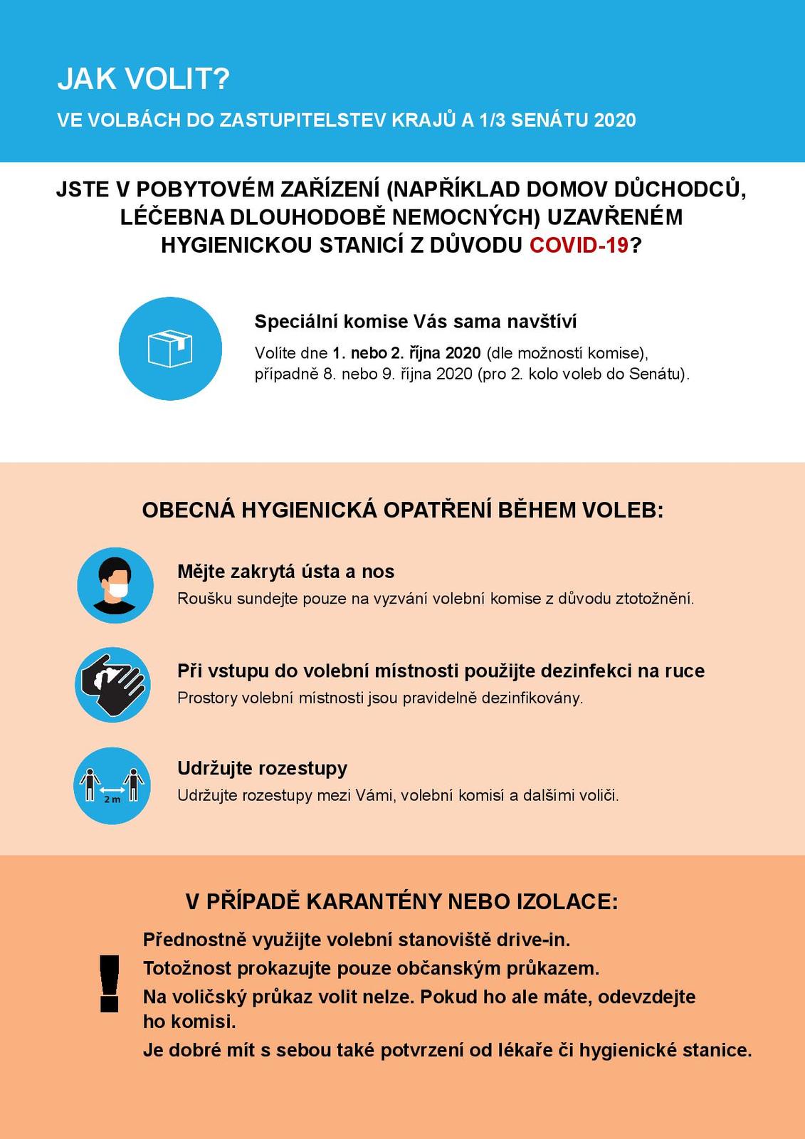 Všudypřítomná opatření zavedená v důsledku pandemie koronaviru se nevyhnou ani letošním volbám, které budou doprovázet zvýšená hygienicko-protiepidemická opatření. Na voliče i volební komisi se vztahuje povinnost nosit roušku. Při vstupu do volební místnosti by měl každý přicházející použít připravenou dezinfekci.