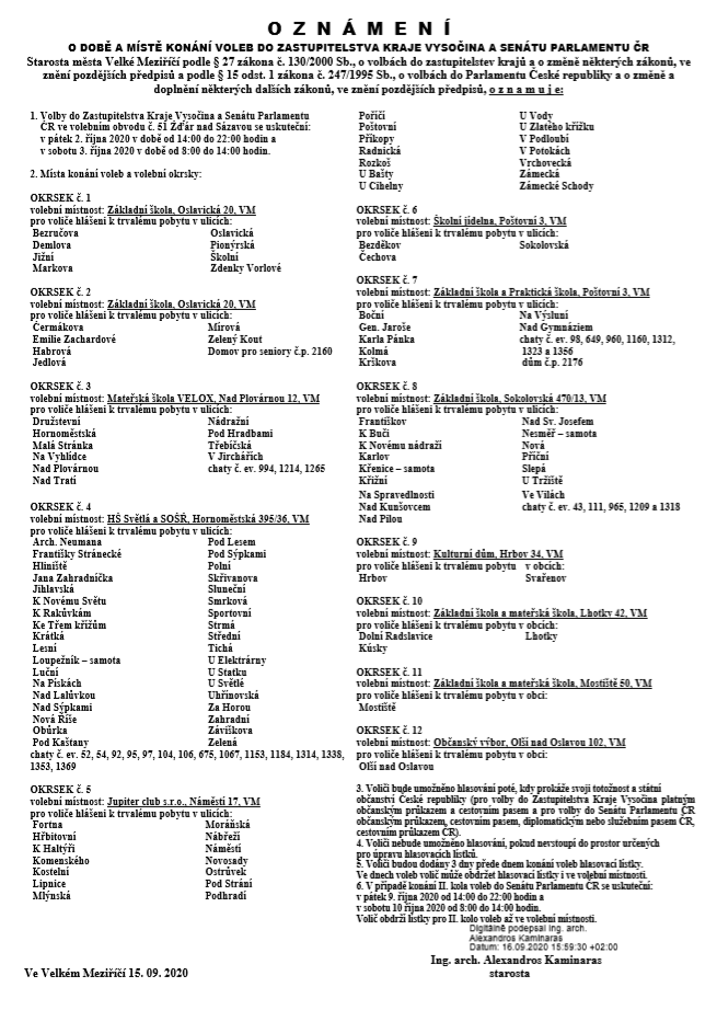 Seznam volebních okrsků ve Velkém Meziříčí a místních částech: