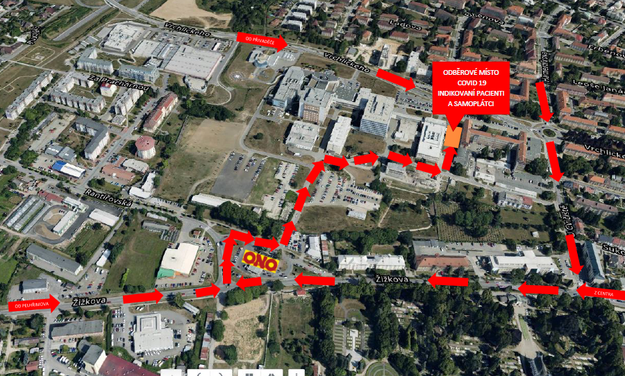 Pacienti, kteří míří na stěr, musí vjet do areálu z ulice Rantířovská (za čerpací stanicí ONO), aby nedocházelo k zahlcení vjezdových bran. Značení je navede k červenému stanu a vyjedou na ulici Vrchlického právě u parkoviště, kde stál stan původně.
