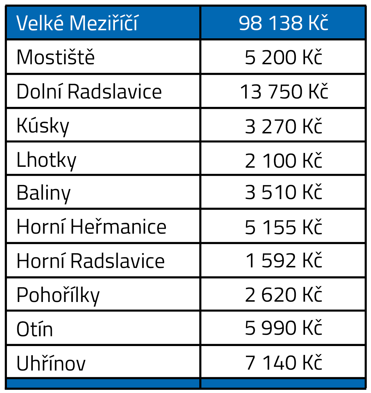 A jaké byly dary obcí na Velkomeziříčsku? Výsledky některých z nich přikládáme v tabulce. Ostatní zveřejníme později, protože kasičky dalších obcí ještě čekají na své rozpečetění. Všem dárcům veliké a upřímné díky.