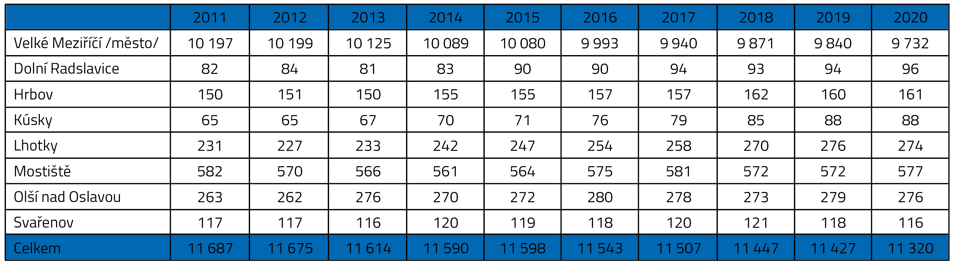 Nejvíce obyvatel ubylo ve Velkém Meziříčí, naopak nárůst zaznamenaly Hrbov, Mostiště a Dolní Radslavice. Ke zmíněnému datu bylo ve Velkém Meziříčí 9 733 obyvatel, Dolní Radslavice měly 96 obyvatel, Hrbov 161, Kúsky 88, Lhotky 274, Mostiště 577, Olší nad Oslavou 276, Svařenov 116 obyvatel. Celkem se narodilo 129 dětí, zemřelo 142 občanů a trvalý pobyt vedený na Městském úřadu Velké Meziříčí mělo k 29. lednu 330 obyvatel.