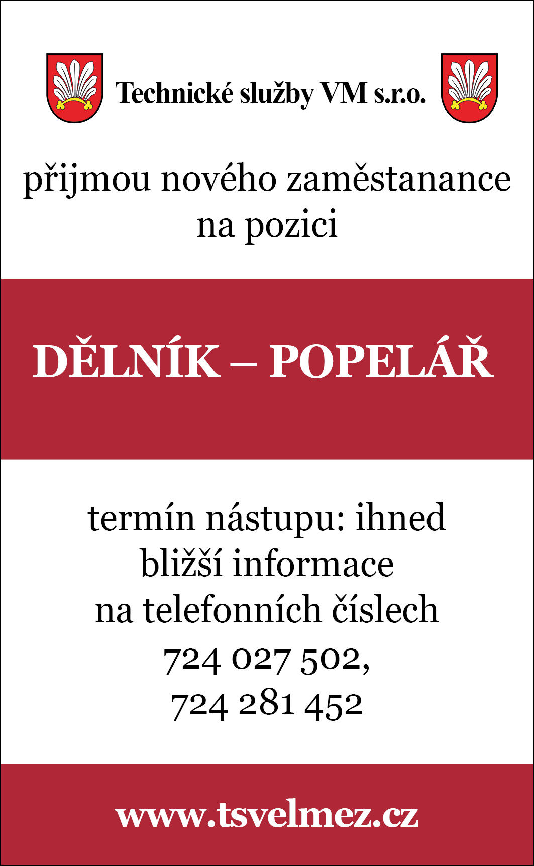 Technické služby ve Velkém Meziříčí hledají nového zaměstnance na pozici dělník – popelář. Vybraný uchazeč může do práce nastoupit ihned. Požadavky na zaměstnance zahrnují zejména samostatnost, spolehlivost a zodpovědnost. Technické služby nabízí řadu benefitů, které obsahují stravenky, týden dovolené navíc, příspěvek na penzijní a životní pojištění a další výhody. Více informací se zájemci dozví na telefonním čísle 724 027 502 (František Burian) nebo přímo u jednatele společnosti Ing. Jaroslava Mynáře – 724 281 452.