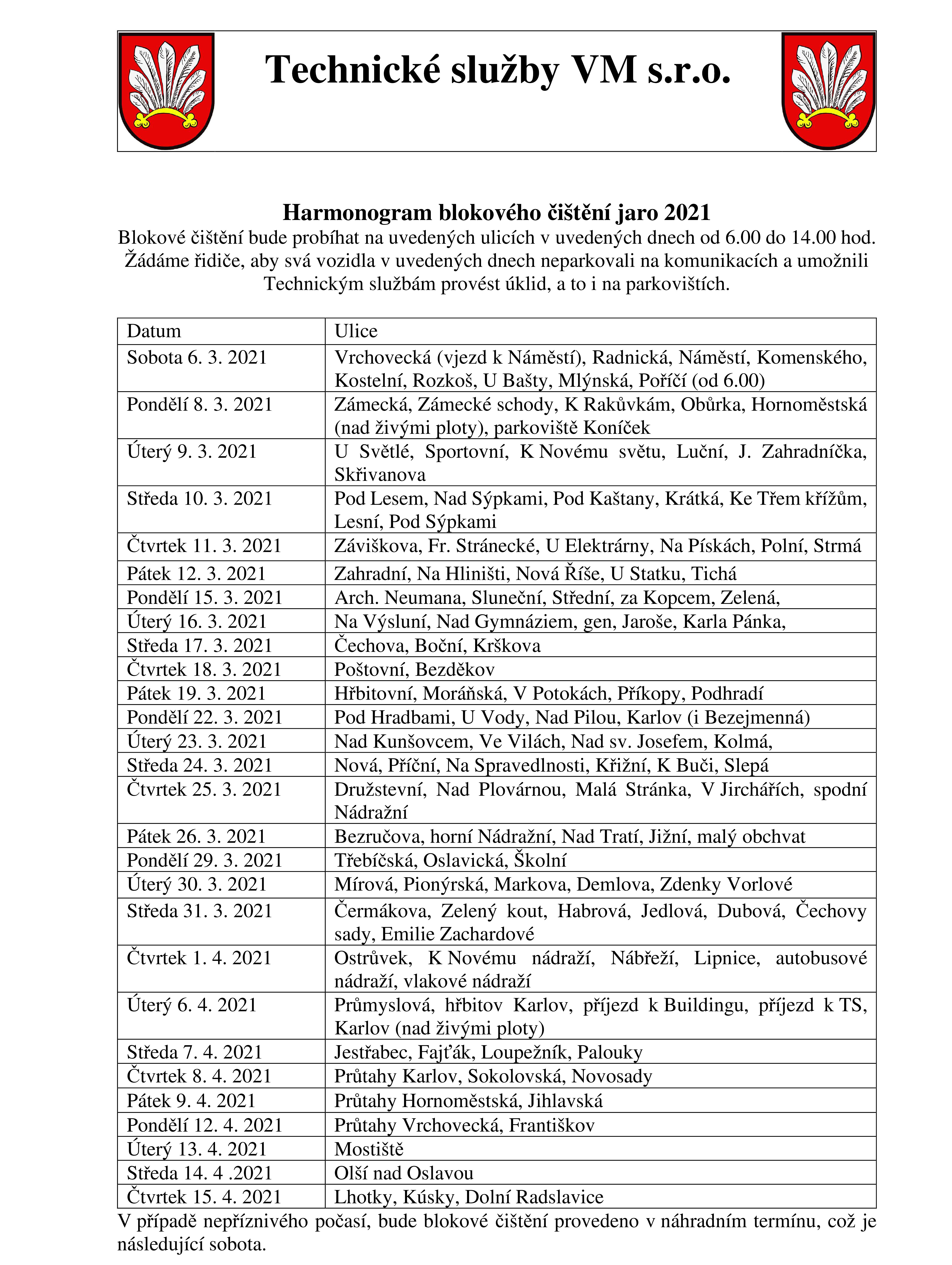 Blokové čištění bude probíhat vždy od 6.00 do 14.00 hodin. Prosíme řidiče, aby svá vozidla v uvedených dnech neparkovali na komunikacích a umožnili pracovníkům technických služeb provést úklid, a to i na parkovištích.